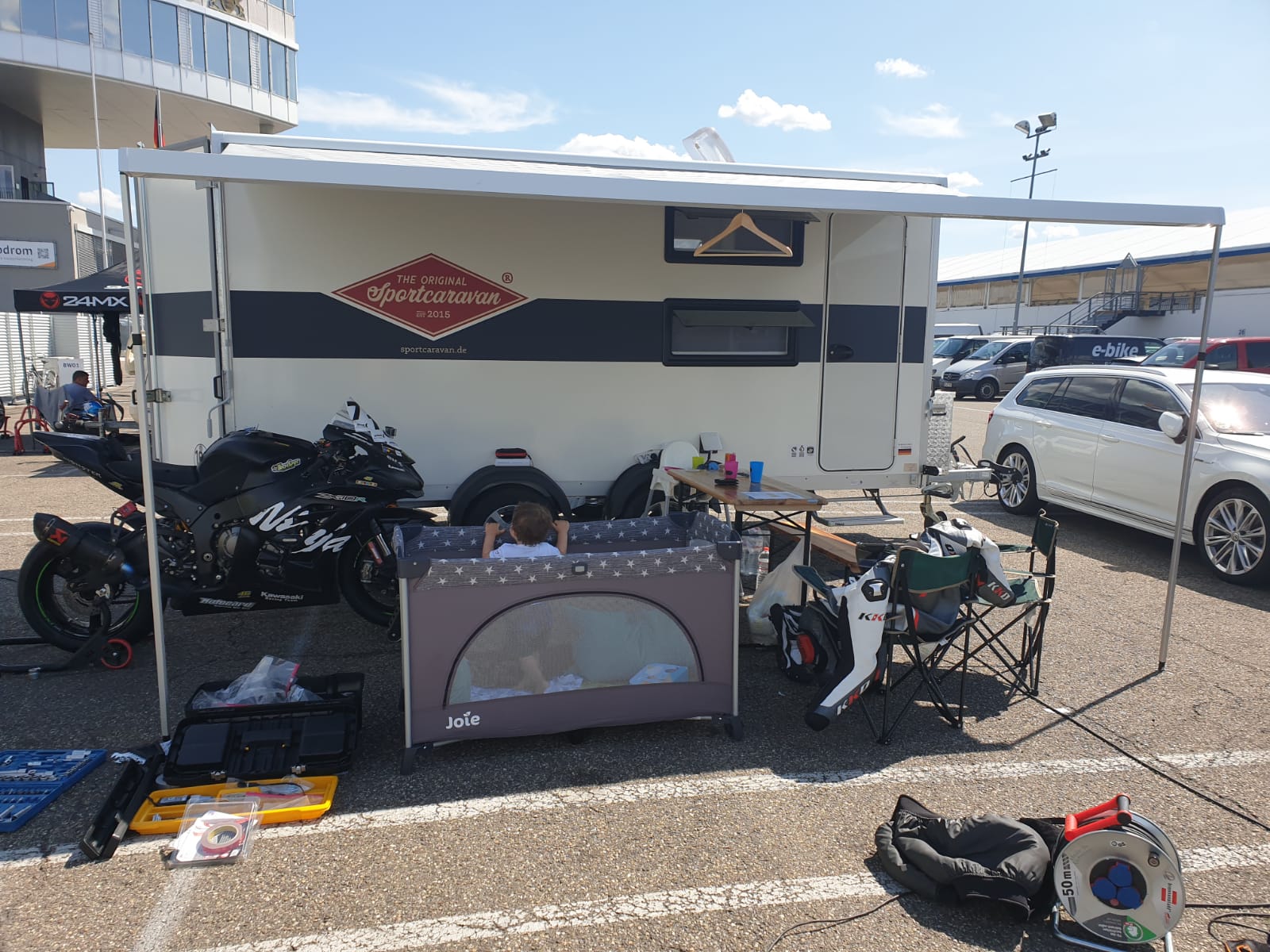 Die Zeit bewegte sich Richtung 7 Uhr und es waren erste Motorengeräusche zu hören. Ich riskierte nochmal einen Blick nach draußen und sah die ersten Aufzynder, welche sich zur Lärmmessung anstellten sowie jene, die zum Instruktorentraining auf ihren Bikes anreisten. Aufgrund meiner Jonny English Mentalität Jonas betreffend, war ich etwas nervös, ob die Motoren Jonas aus dem Schlaf reißen. Das wäre nicht so geil, weil der Herr ein ziemlicher Morgenmuffel ist und so gar keine gute Laune hat, wenn er in seinem Schönheitsschlaf unterbrochen wird. Kurzes Productplacement: Der Sportcaravan ist echt gut gedämmt. Die Lärmmessung bereitet keine Probleme. Mit Erleichterung lies ich beide schlafen und begab mich erstmal Richtung Nasszellen. Jonas war irgendwann wach und schaute sich das Treiben erstmal aus sicherer Entfernung an