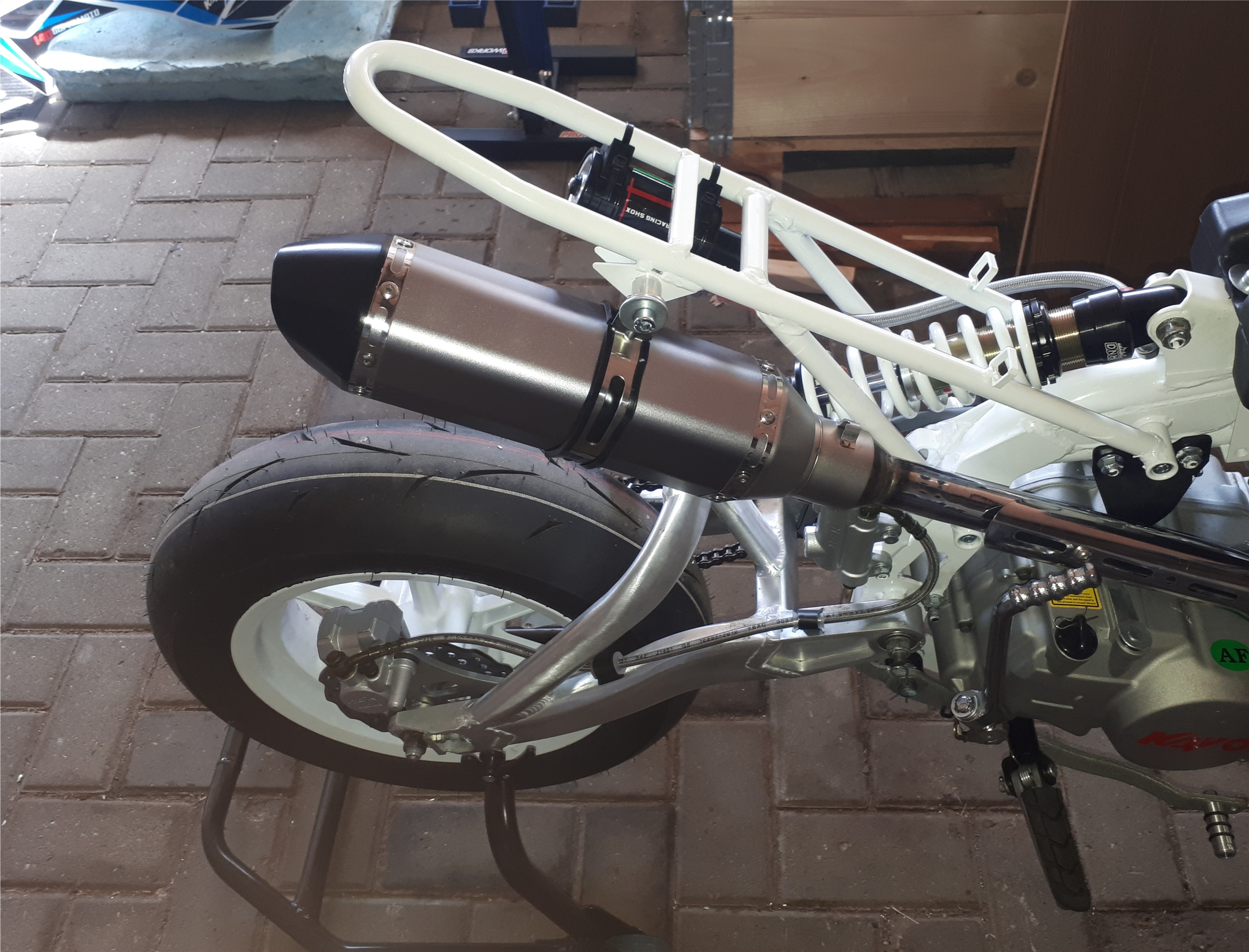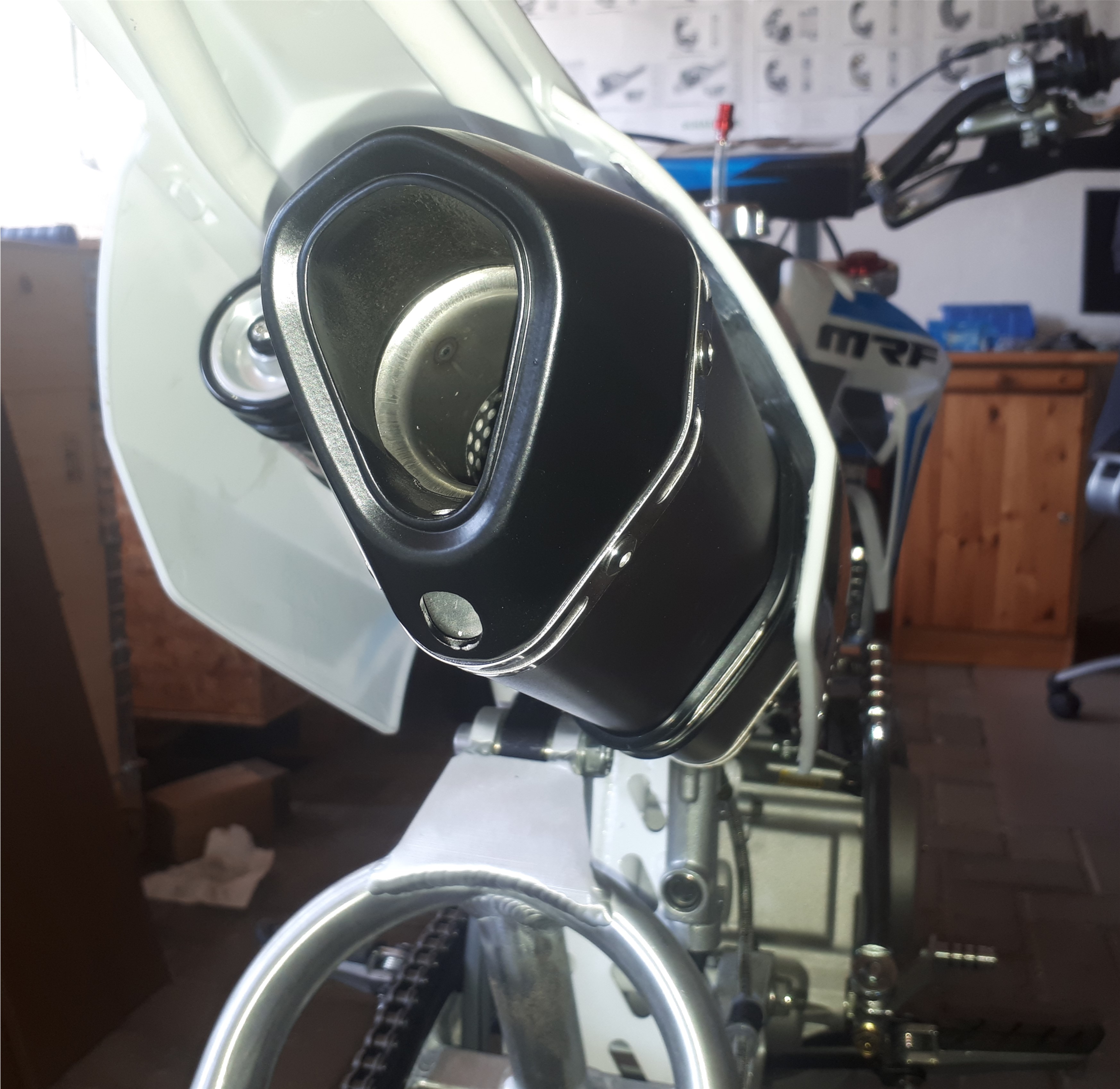 Dabei ist ein Adapter von 51 auf 38mm, um das Ding am Pitbike auf den Steckflansch des ori ESD zu bekommen, aber das gefiel mir nicht.