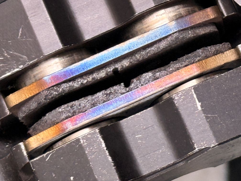 Hier mal die Beläge nach einem halben Tag auf einer Strecke mit einer langen Geraden und hartem Anbremsen (waren neu):
