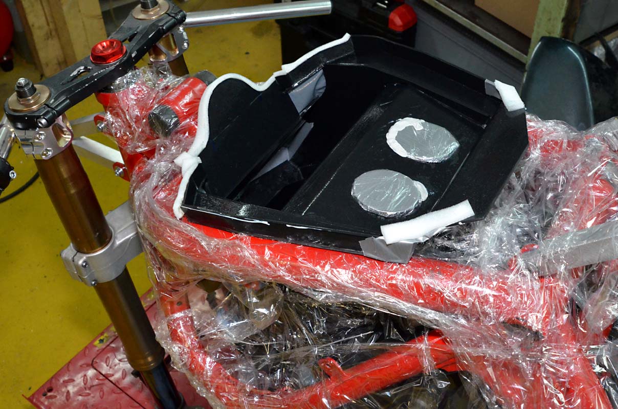 Frischhaltefolie ist so ziemlich das einzige, auf dem der PU-Schaum nicht hält. Also damit das Mopped großzügig eingepackt. Die gebastelte Form der Airbox mit Trennmittel versehen und zur Abdichtung zwischen Airboxboden und Tank einfach TESA-Moll verwendet.