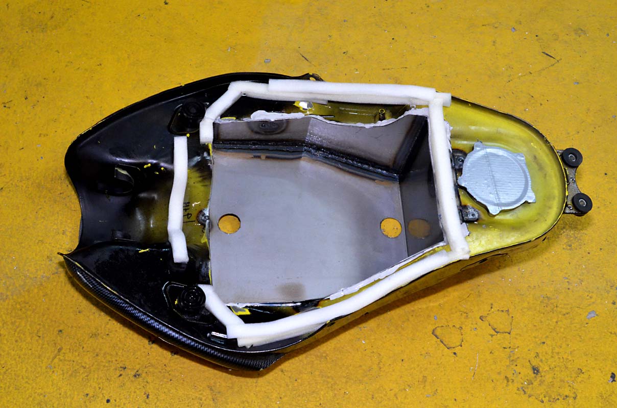 Das Blech hat natürlich auch Trennmittel erhalten. Das Ganze auf dem Mopped montiert und dann den Holraum über die beiden Löcher im neuen Tankunterboden mit dem 2K-PU-Schaum gefüllt und etwas abgewartet. Nach wenigen Minuten ist das 2K-Zeug soweit fest, dass man es schneiden kann. Den Tankboden samt Airbox vom Mopped nehmen... und das Gewürge geht los.