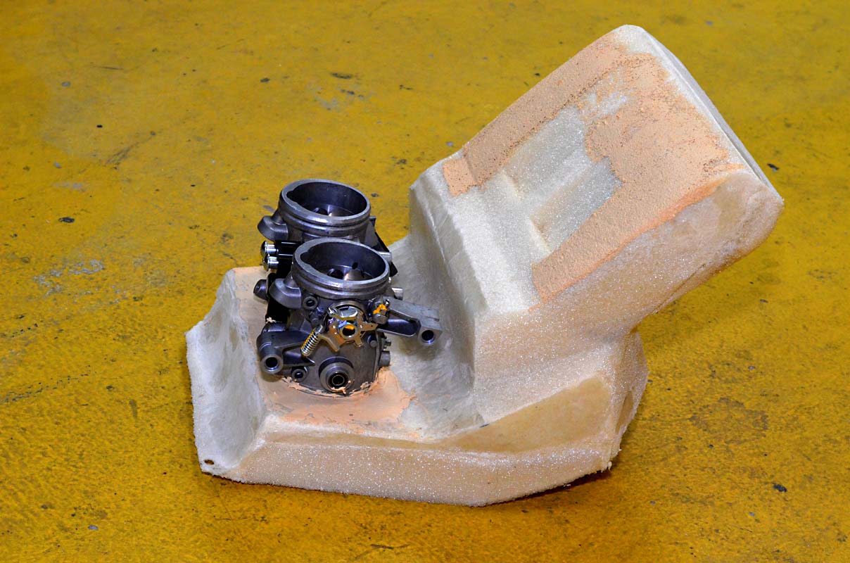 Die PU-Airbox ist in 2 Teile getrennt. Der untere Teil wurde so bearbeitet, dass er leicht eingebaut werden kann und die Gaszüge links an die Einspritzanlage laufen können. Auf dem Foto sind gerade die bei der Schlachtung der ZX10R Einspritzanlage übrig gebliebenen Bodys eingespachtelt. So sollte ich eine halbwegs saubere Anformung der Bodys in der Airbox erhalten. Reichlich Trennmittel auf den Bodys sorgt dafür, dass man die Teile auch wieder raus bekommt, ohne alles in Stück zu reißen.