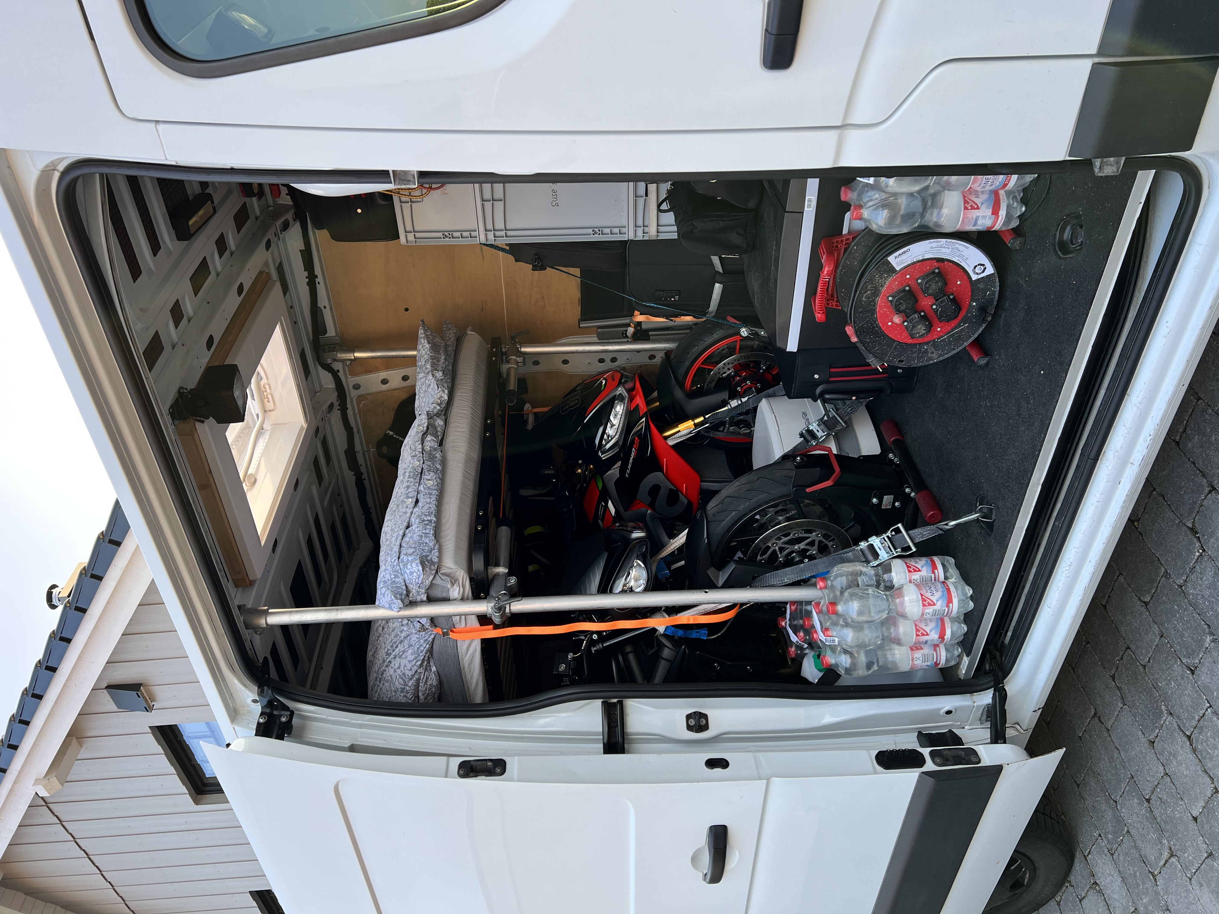 Das einzige was weggeflogen ist, war meine Regenkombi auf der rechten Seite- der Bücherregal Halter verbiegt sich während der Fahrt und dann rutscht der Haken vom Bügel runter. Die Kombi hab ich dann vorne auf meine Reifen gepackt. Hinter meiner schöner-wohnen Decke hab ich meine 2. Verkleidung, 5-6 Reifen, Kompressor und leer Kanister formschlüssig geladen. Da ist nix passiert.