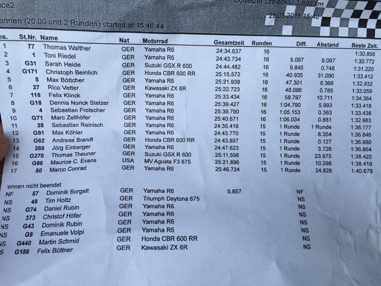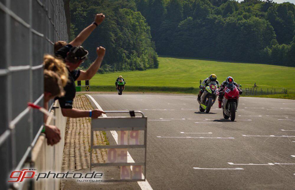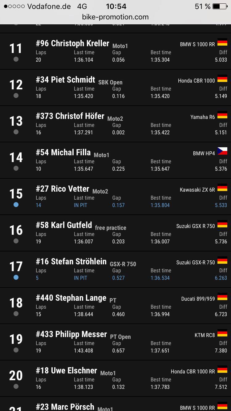Nachdem ich heimlich auf ein Regenrennen gehofft habe, hat es zwar vor beiden Rennen getröppelt, aber es hat einfach nicht gereicht :D Im ersten Rennen lief es an sich super. Die zahlreichen Zuschauer und Freunde, sowie die Familie haben einen motiviert, sodass ich bereit war alles zu geben. Ich wusste, die vielen Fahrer vor mir haben mich nicht zu interessieren, außer Tim. Am Start kurz auf P1 liegend, könnte ich diesen nicht lang halten und Tim fuhr an mir vorbei. P2 stand nun laaaaange Zeit auf der Anzeigetafel. Leider auch die :"+0" darunter, die mir anzeigte, das mir jemand im Nacken hängt. Frosch, Rico? Wer ist es wohl ? Drei-vier Runden vor Schluss hatte ich auf Start/Ziel einen bösen Rutscher, der mir ein wenig Vertrauen nahm und Speed kostete. Als dann mein Freund Fifty an mir vorbei ging, wollte ich ihm gern folgen und war beruhigt, das nur er es war, und kein stk600 Fahrer. Wieder über die Ziellinie fahrend, stand immer noch der Vorsprung bei +0 und ich ahnte böses. Rico schlüpfte auch noch durch und ich wurde auf Platz3 verwiesen. Als in der letzten Runde eine Überrundung anstand, musste ich vom Gas gehen und Rico war weg. Mit Platz 3 und einer 1.32.9xx min war ich zwar nicht schneller als letztes Jahr, aber das Ergebnis erfreute mich trotzdem :cool: Zum Glück funktionierte der Schaltautomat im Rennen, obwohl er in der Warm Up Lap schon wieder zickte.