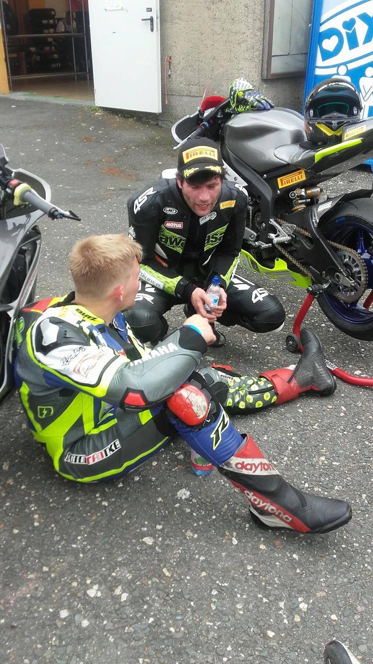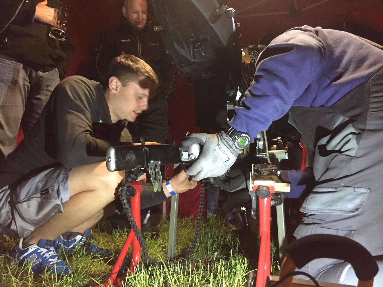 Unser Freund Pascal Lenz hatte leider im Nassen einen Unfall und die Schwinge war hinüber. Bis in die Nacht hat vor allem mein Teamkollege dort mitgeschraubt!