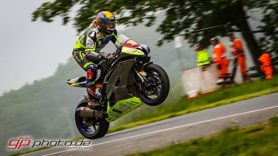 Die Freude wurde dann durch die warme Straße zu Nichte gemacht und außer in der Stadt unten und in der ersten Kurve, war die Strecke zum Rennen trocken. Verunsichert durch den Rutscher hab ich den Reifen drehen lassen. Also raus auf die Steexke, am Buchhübel allen Leuten gewunken und dann volle Konzentration. Einige Fahrer waren nicht mehr am Start, aber das war mir egal, denn ich will nur eins: Vollgas geben !