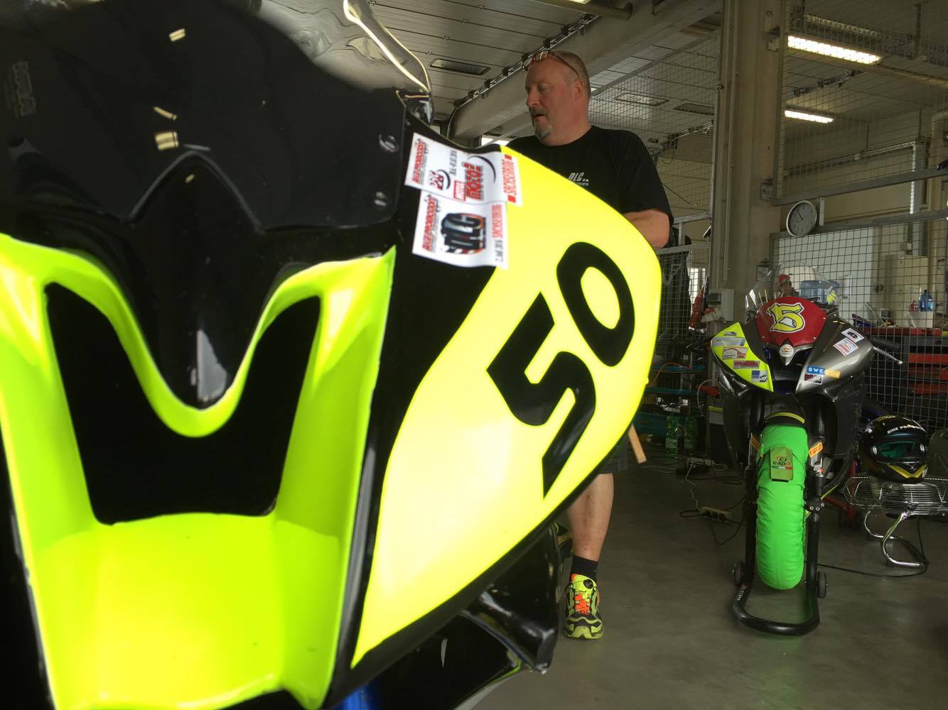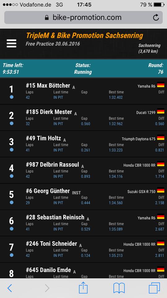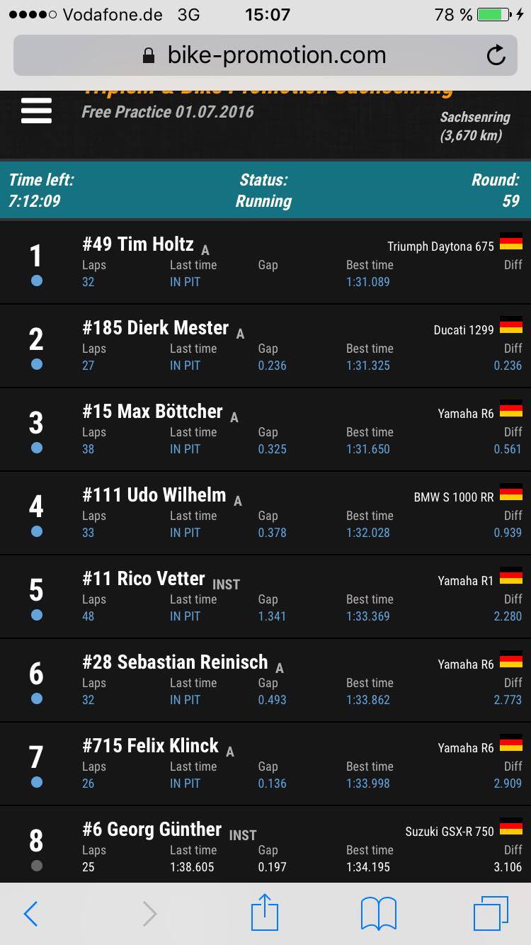 Heute lief es richtig gut ! Das steht fest. Ohne einen Klick am Fahrwerk zu ändern, gab es nur eine Mission: Vollgas. Und nachdem ich wieder einen Turn die Instruktorweste an hatte, hab ich einen neueren gebrauchten Reifen hinten aufgezogen und war kampfbereit. Mein Boxenkollege Fifty reiste an, und äußerte, das es einfach mega heiß ist und jetzt aufgrund der Motorleistung und der Hitze keine Zeitenverbesserung möglich sei. Tim Holtz und ich zeigten ihm aber, dass dies nicht so ist !! ;)