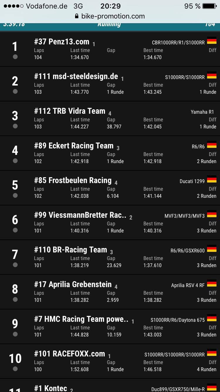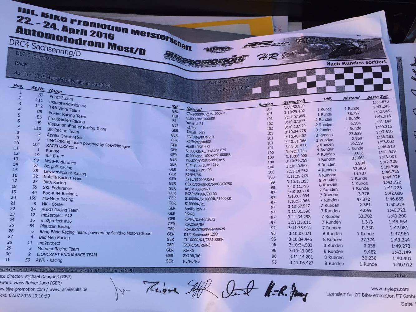 DLC: Die todsichere Siegesstrategie ging leider nicht ganz auf^^ Nach dem passablen Regenrennen entschieden wir uns das ich den Start fahren soll. Benny , unser dritter Mann fuhr beide DLC Zeittrainings und sicherte uns Platz 20 in der Startaufstellung. gut gestartet machte ich bestimmt 10 Plätze gut und wurde nach und nach ein wenig durchgereicht. Es pisste ununterbrochen und ich habe leider meine Regenjacke vergessen :D Wir führten kurzzeitig die Klasse 3 an, allerdings war das Eckert Racing Team super stark mit ihrem ersten Fahrer Ralf. Die Sicht auf Start/Ziel war zum Teil bei NULL, wenn 4-5 Fahrer vor einem fuhren. Das Wasser lief die Berge hinunter, es regnete immer mehr...wirklich keine leichten Bedingungen. Nach einer Stunde der Wechsel auf Basti. Der zog ebenso eine Stunde durch und sicherte und immer mehr Abstand zu Platz 3, Borgelt Racing. Dann ging Benny auf die Strecke und wir spekulierten auf einen weiteren Wechsel. Als die Zeiten kanpp 15min vor Rennende kippten, ging ich nochmal mit Slicks raus und konnte noch vorm Klasse 4 DLC Meister 2016, Team Aprilia Grebenstein, ins Ziel fahren.