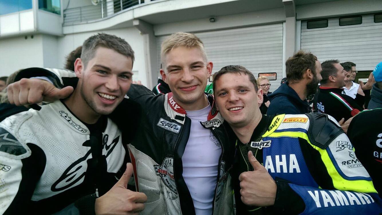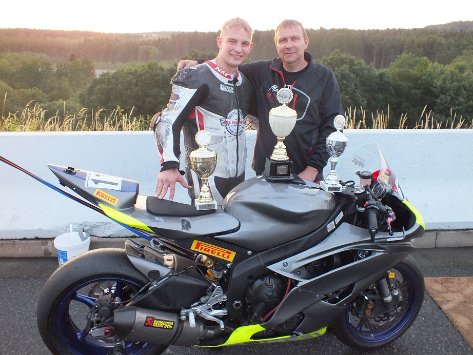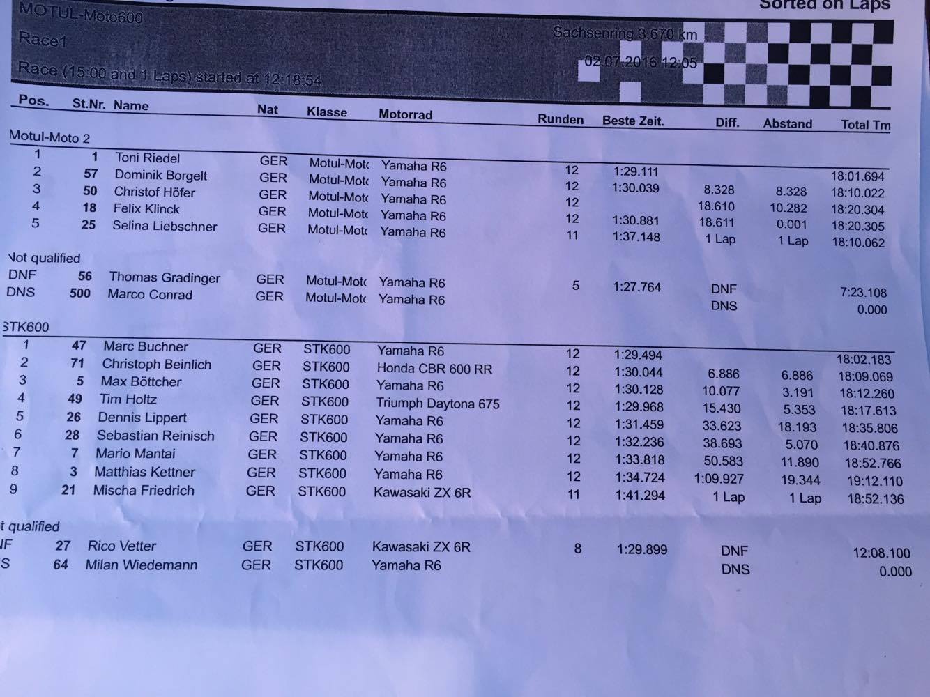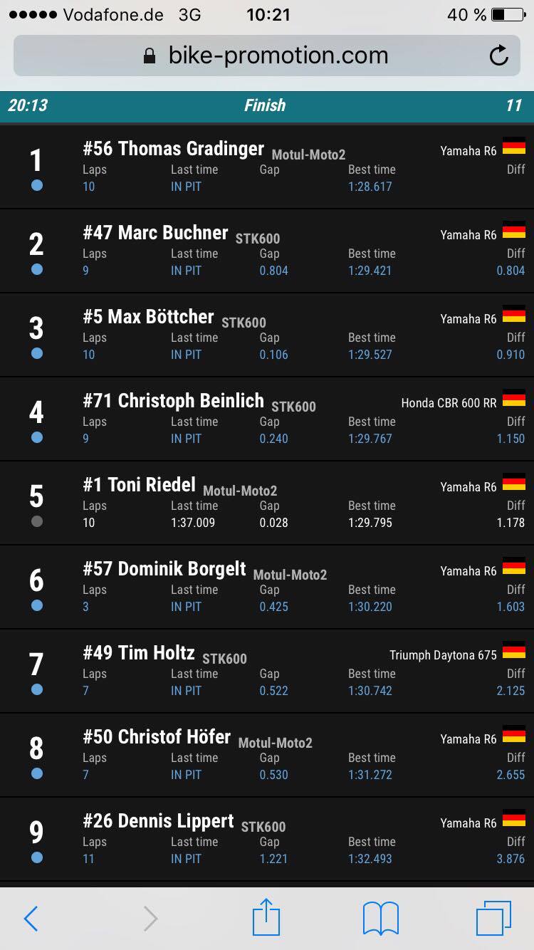 Das Wetter wurde immer unbeständiger, wir drehten nur den Hinterreifen und erwarteten jede Sekunde Regen. Allerdings blieb es trocken. Nach einem guten Start fuhren Buchner und Gradinger vorn weg. Tim und Christoph starteten mit mir eine kleine 3er Gruppe. Als Tim sich verbremste und wenige Meter durchs Kies musste, war er hinter uns. Ab Rennmitte hatte ich hinten keinen Grip mehr links herum und musste nicht nur Christoph ziehen lassen, sondern auch noch Dominik Borgelt ( Moto2-Wertung) nach einem Motorrad-Körper-Kontakt ziehen lassen. Gradinger schied mit Defekt aus und ich kam somit als 3. in der STK600 Wertung ins Ziel.