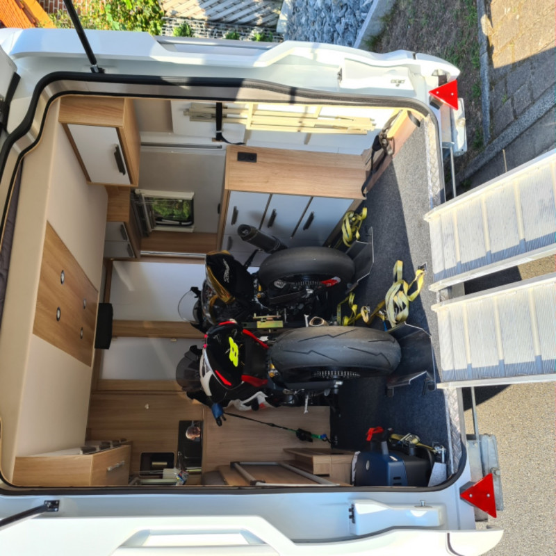 den Zuschlag hat jemand bekommen den ich kenne und hab das nach 5 Jahren Nutzung bekommen was ich investiert hatte. Die investierte Arbeit bekommt man nicht bezahlt aber dafür haben wir ihn ja auch 5 Jahre genutzt. Er ist jetzt in guten Händen und bin mir sicher das der Käufer in 5 Jahren das gleiche wiederbekommen wird insofern er nicht herunter rockt. Also als Low Budget Variante kann ich das Konzept auch weiterhin nur empfehlen! Aber nun zum Deseo, man wird älter und der Körper schreit nach mehr Komfort und das bietet der Deseo im Gegensatz zum Ponnyhänger. Den Deseo gibt es als Ausführung für ein oder zwei Motorräder, mehr Maschinen passen da aber auch nicht rein. Für 2 Maschinen muss zwingend die Auflastung auf 2t (1,5t Serie) gewählt werden und auch die reichen so gerade eben wenn neben den beiden Maschinen + Equipment auch noch eine Markise und Satanlage montiert werden soll.
