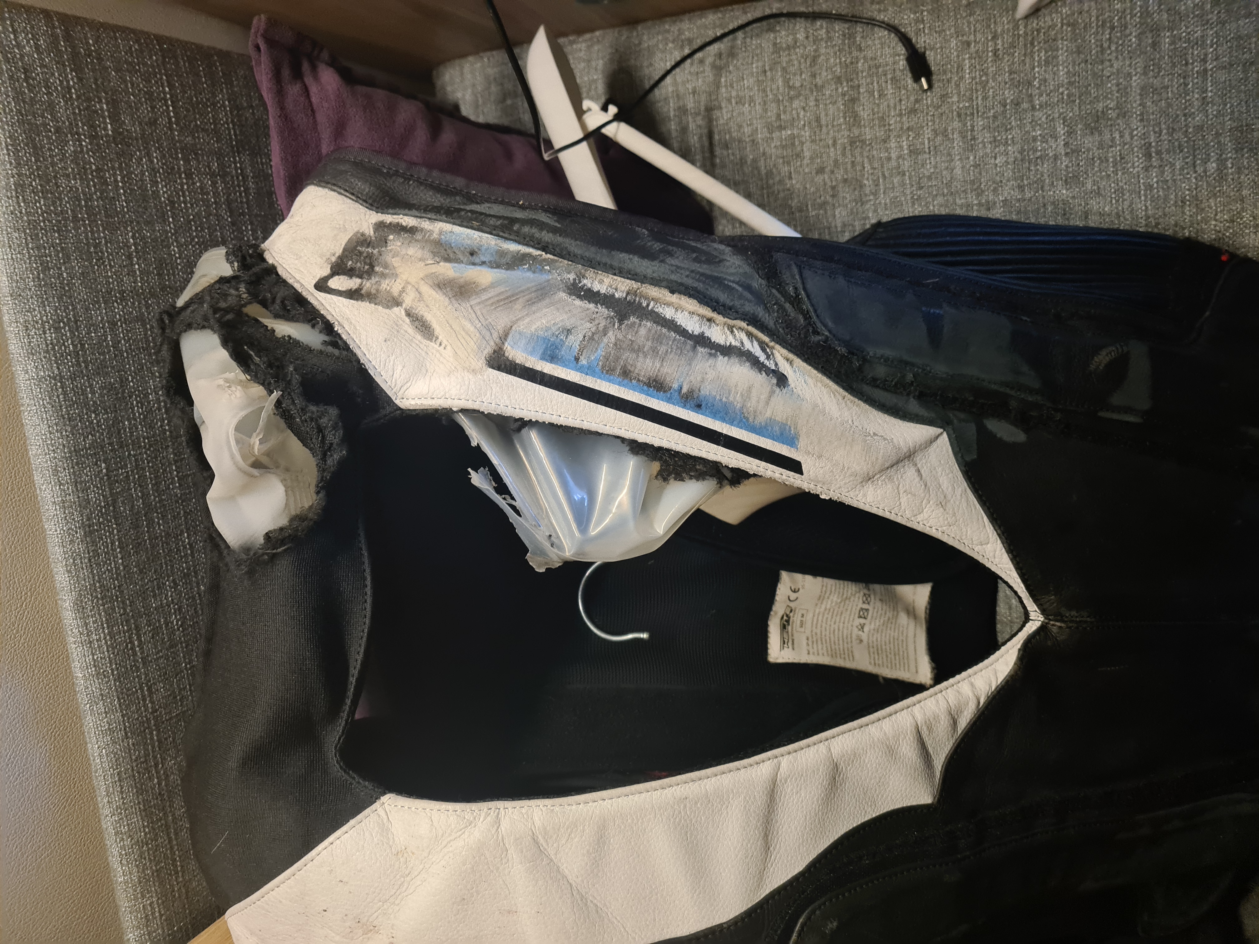 Ja die Weste hat schon ordentlich was abgefangen und die Kombi vor dem Totalschaden bewahrt denke ich, dennoch bin ich mir sicher das ein Integrierter Airbag der auch über die Schulter hinaus bis zum Oberarm geht mehr bewirkt hätte, darum lasse ich mir ja einen neuen Kombi machen und nehme den alten nach Reparatur für Ersatz und zum Pitbiken.