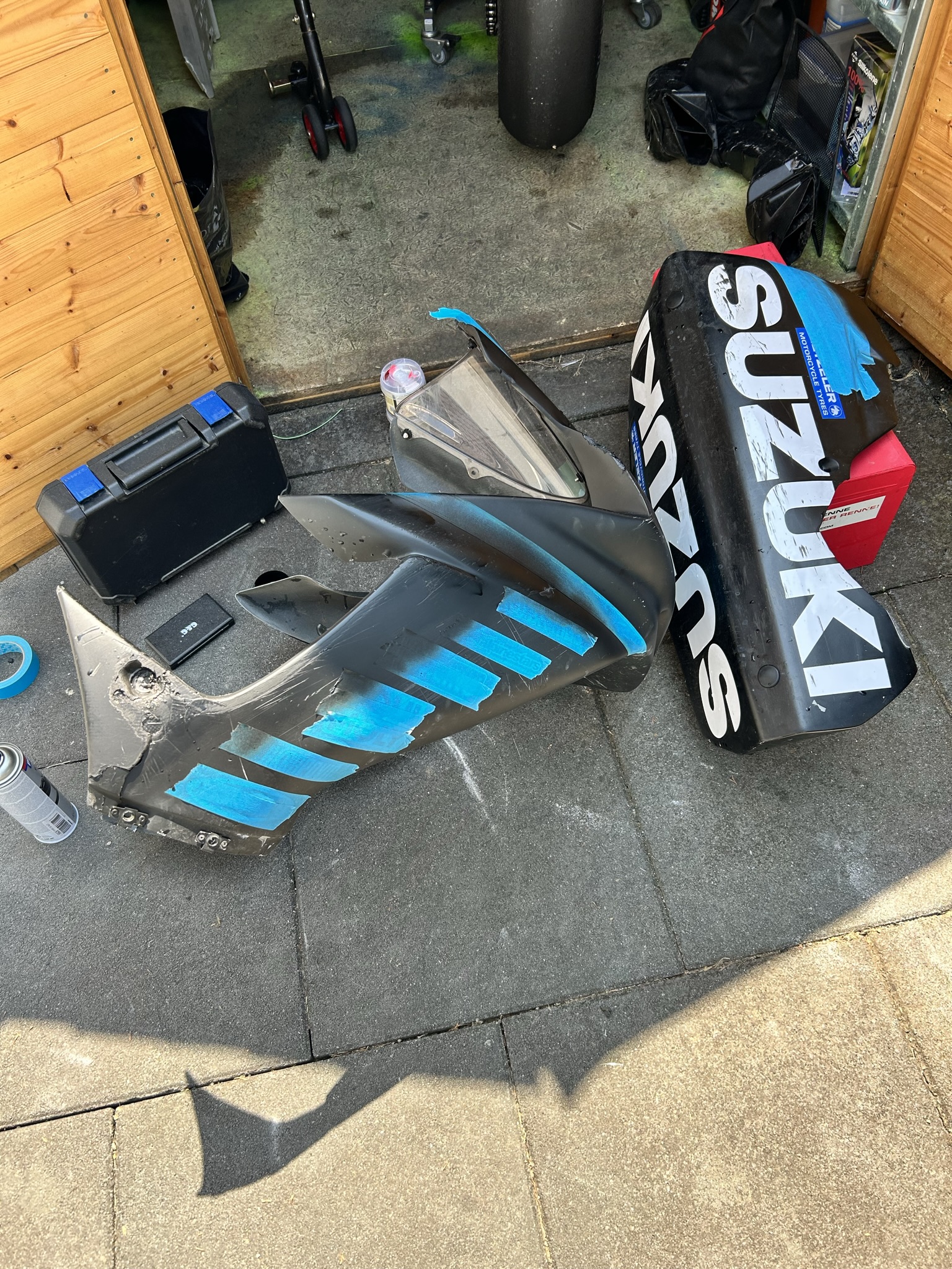 Die Verkleidung hält auch wieder zusammen, nicht schön aber selten. Innen mit GFK alle Löcher zu gemacht, dann aussen etwas spachtelmasse drauf und ne alte Schwarz/Matte Dose ausm Keller und knallhart drüber sprühen. Fertig aus, mehr Aufwand mache ich mir hier nicht, hält und sollte wieder ans Bike passen. Das sehe ich aber morgen wenn ich alles montiere.