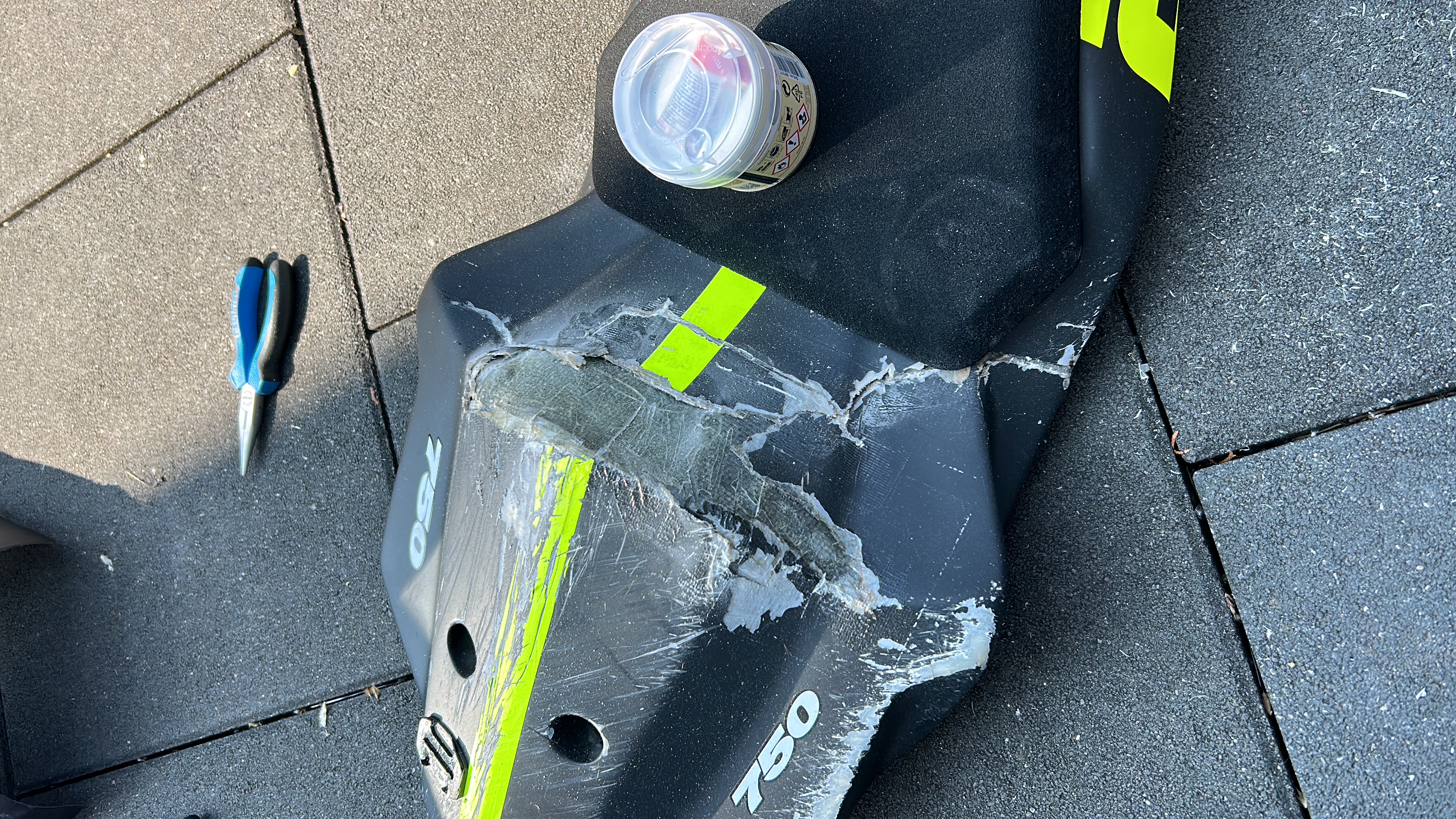 Verkleidung geht noch, sieht echt nur schlimmer aus als es ist. An der vorderen Verkleidung an beiden seiten je 1x gebrochen, gerade mit GFK zusammen kleben und gut.