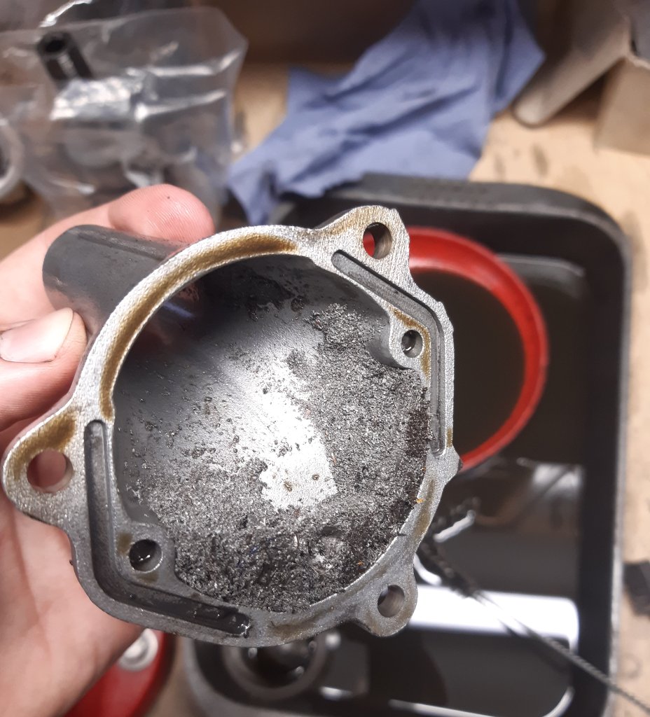 Wieder zu Hause ging es dann ans Zerlegen des Motors. Zum Glück war das Getriebe noch brauchbar. Der Kolben allerdings… Seht selbst.
