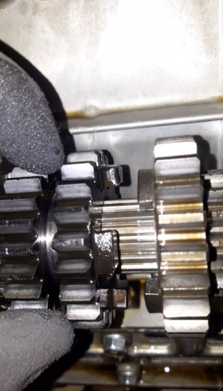 Nach einem längeren Motivationstief kam ich kürzlich dazu den Motor auszubauen und auf die Werkbank zu legen. Wie vermutet stellte sich heraus, dass die Nocken der Zahnränder vom 5. Gang rundgeschlagen waren.