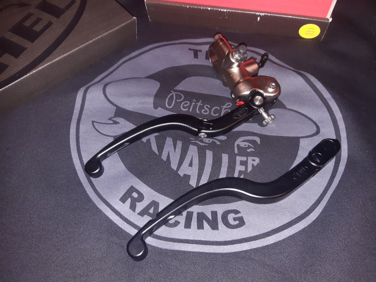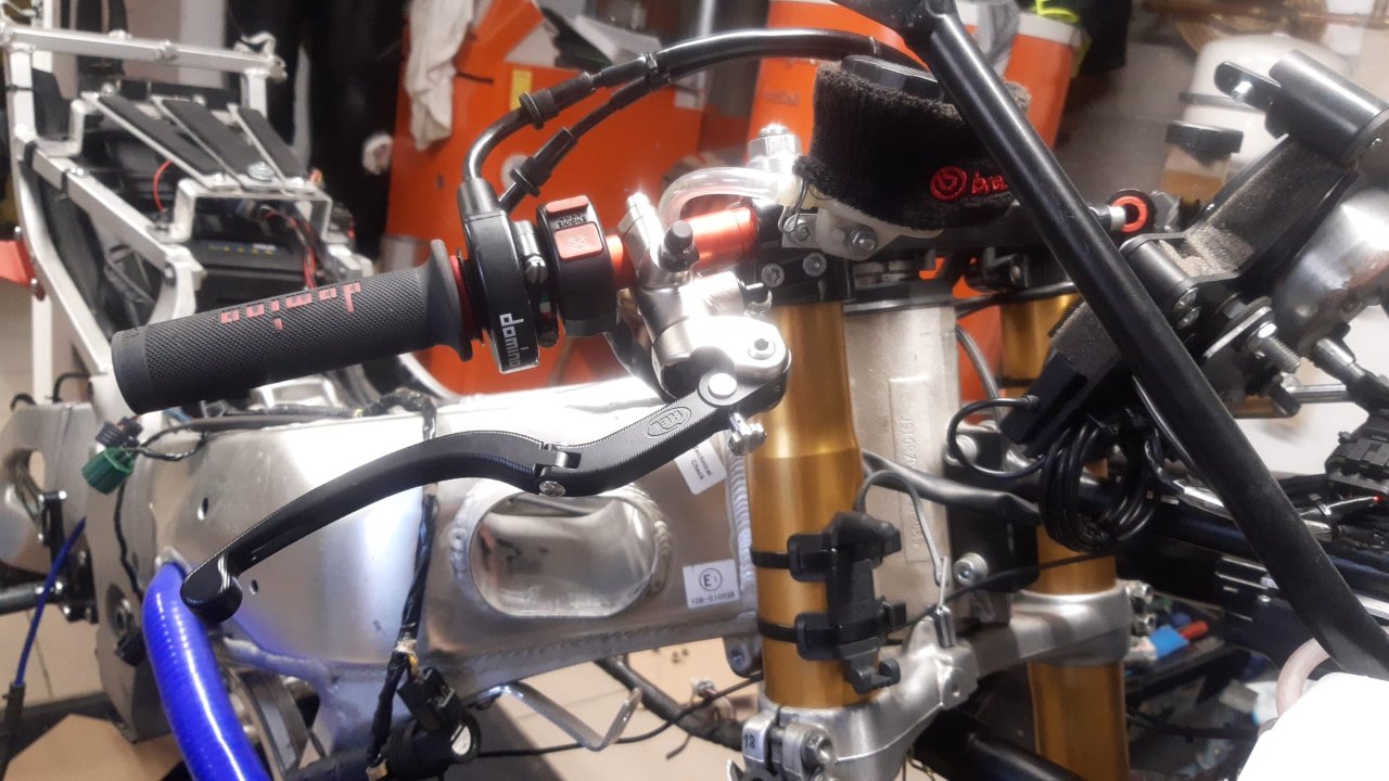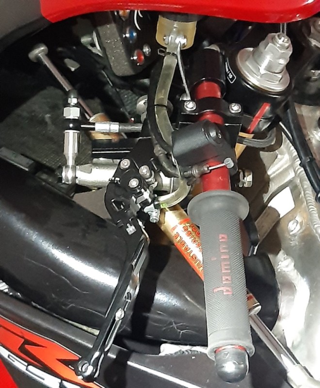 Bei der Vorderradbremse gab es eine größere Änderung… Ich hatte mich nämlich entschlossen meine Brembo RCS Pumpe zu verkaufen und mir stattdessen eine neue, aus dem vollen CNC-Gefräste Pumpe von HEL zu holen. Ein echtes Prachtstück, dem man die Wertigkeit sofort ansieht. Bei der Schlauchverlegung musste ich leider etwas kreativ sein, da es anders nicht mit meinem Behälter passen wollte. Dafür hatte ich jetzt wieder Platz, um den Startknopf näher zurück an den Daumen zu setzen. Für Endurance Rennen ein großer Vorteil!