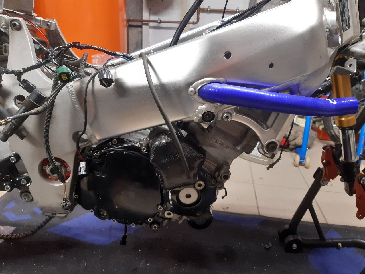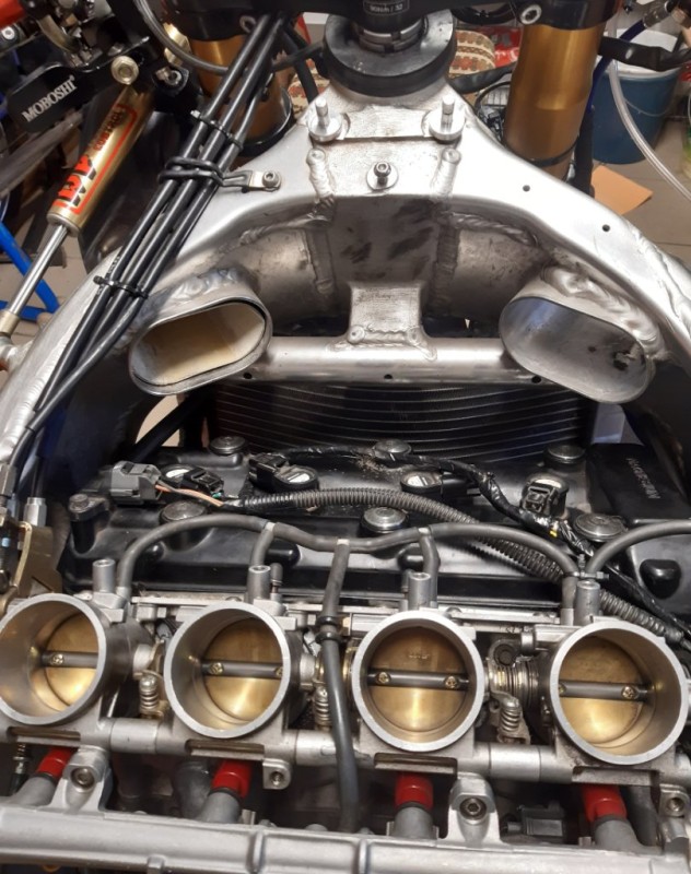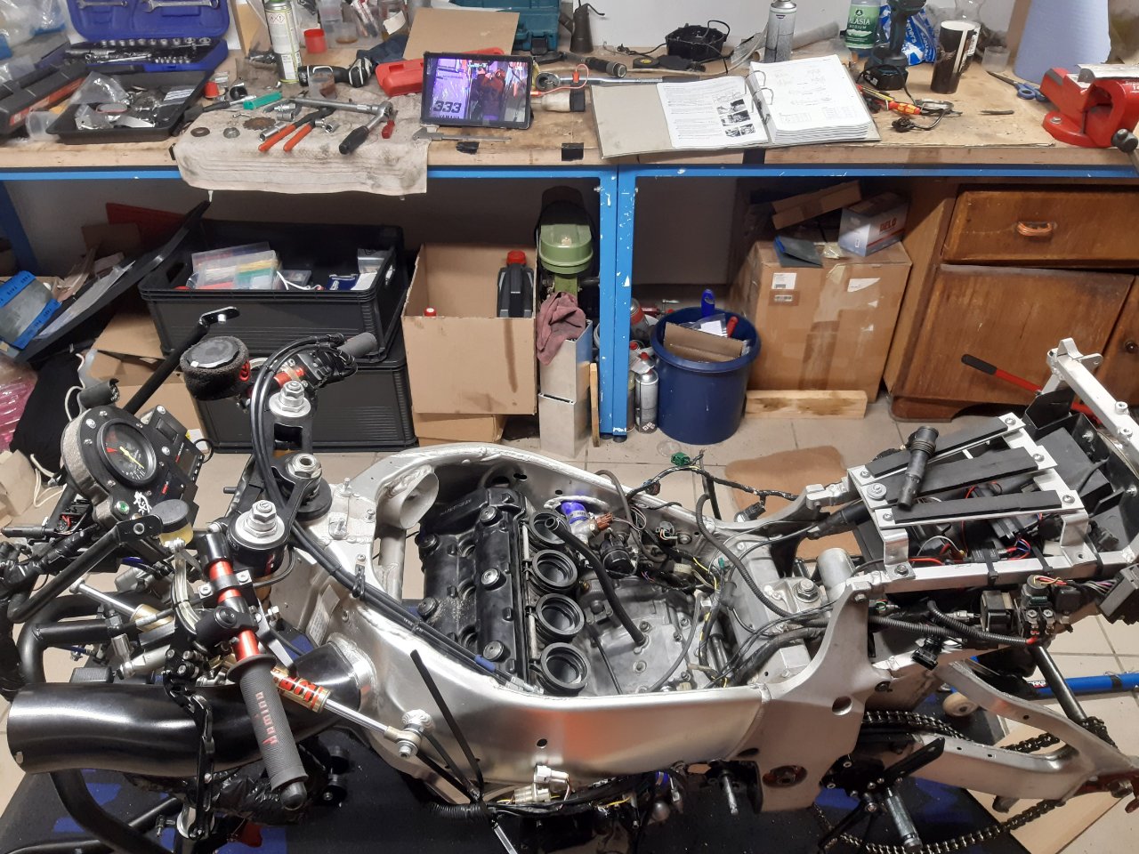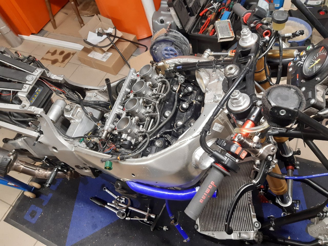 Motor wieder zusammen? – Check! Aber wie lässt sich dieser schwere Klotz jetzt am Besten wieder montieren? Die Antwort war der Wagenheber. Mit einer Hand den Motor auf dem Wagenheber balancierend irgendwie die unteren Montagepunkte auf Linie gebracht… und zack war der erste Bolzen drin. Der Rest war ein Kinderspiel, dass natürlich mit Sorgfalt zu genießen war. Motor eingefädelt und festgeschraubt, alle Kabel wieder sorgfältig angeschlossen, den Auspuff samt neuen Dichtungen und begradigten Schellen wieder montiert, Kühler dran, dann die Einspritzer-Einheit und die Airbox wieder drauf. Beim Tank war etwas mehr Arbeit nötig, da ich zum einen alle Schläuche endlich auf abdichtende Schnellverschlüsse umbauen wollte und außerdem noch einen Abgang angebracht habe, um nach den Turns den Tank zu leeren und auszulitern. Danke Bernd für den Tipp!