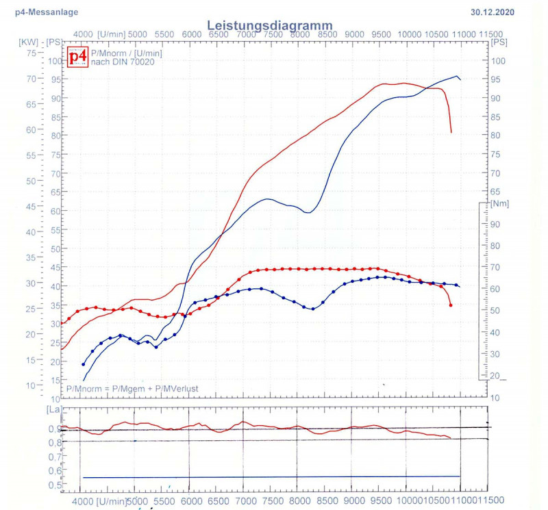 Rot zeigt eine der Messungen mit dem „alten“ Kopf, so um die 95 PS. Blau die Messung mit dem überarbeiteten Kopf, allerdings noch ohne jede Abstimmung hinsichtlich Gemisch, Ansaug- oder Auspufflänge. Das Diagramm zeigt einige sehr erfreuliche Punkt auf: