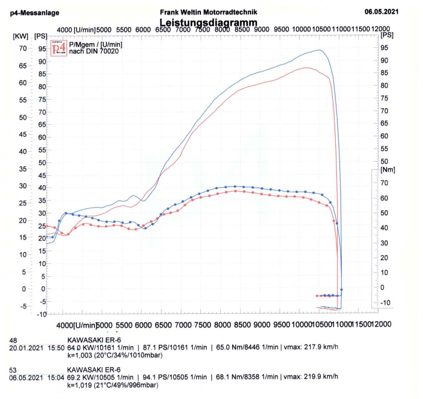 Vor der Montage habe ich den Motor noch ausgelitert um die Verdichtung zu überprüfen. Da passten „Soll“ und „Ist“ perfekt zusammen, liegt aktuell bei 13:1. Nachdem alles wieder zusammengebaut war und die ER6 auf eigenen Rädern stand, ging es nochmals auf den Prüfstand.