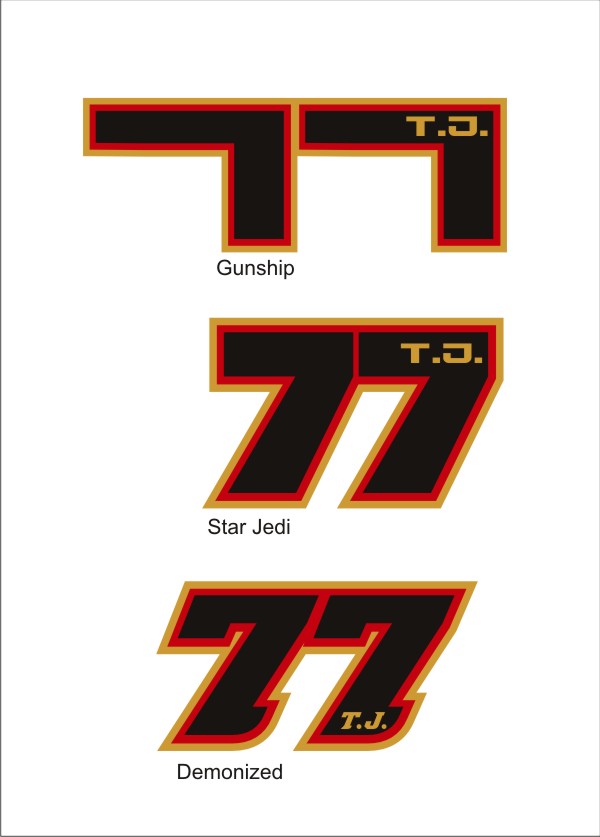 für meine Triumph Daytona 955i brauche ich die Startnummer 955, und zwar in Schwarz, einmal mit Umrandung rot / weiß und einmal mit Umrandung dunkelgrün / weiß.