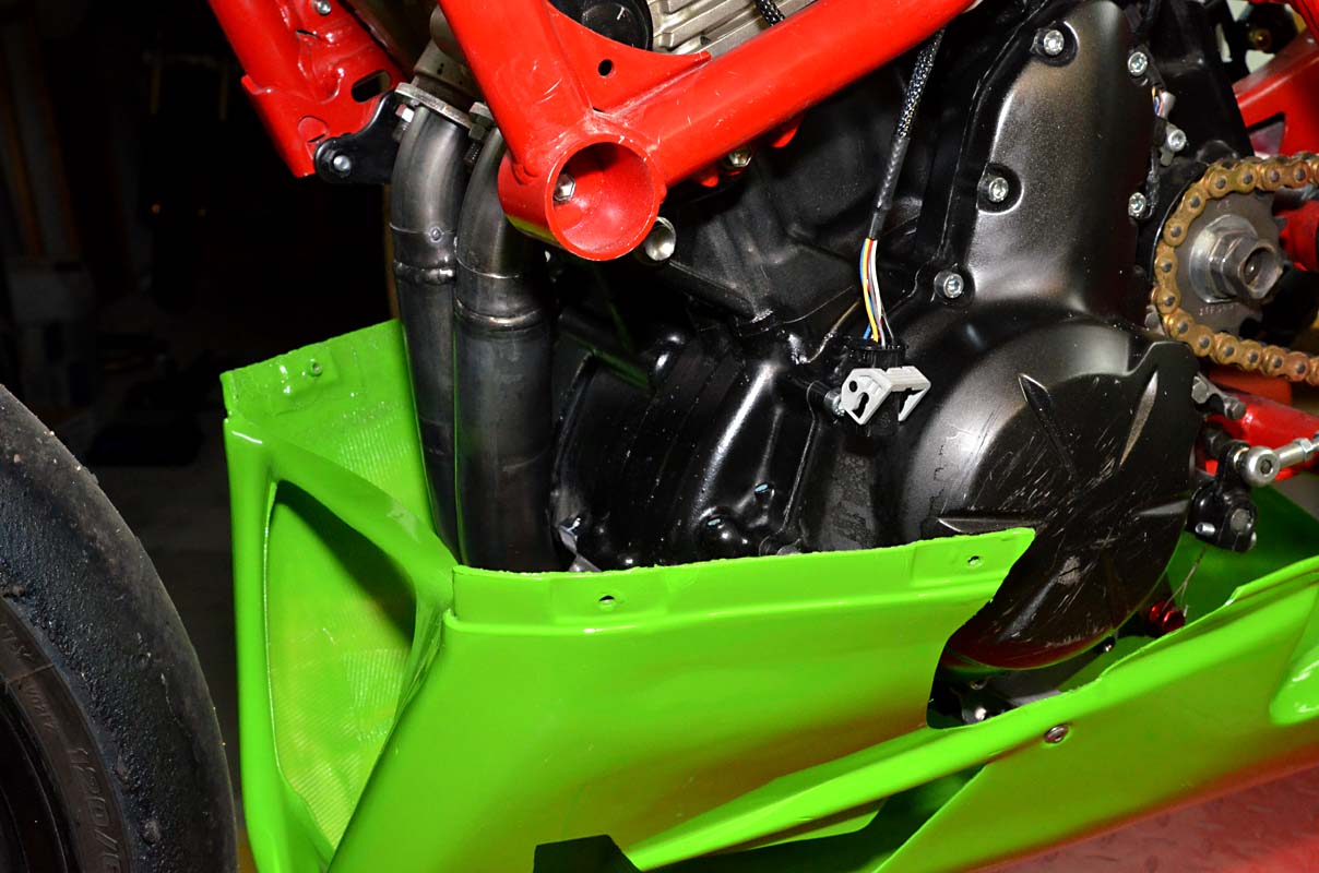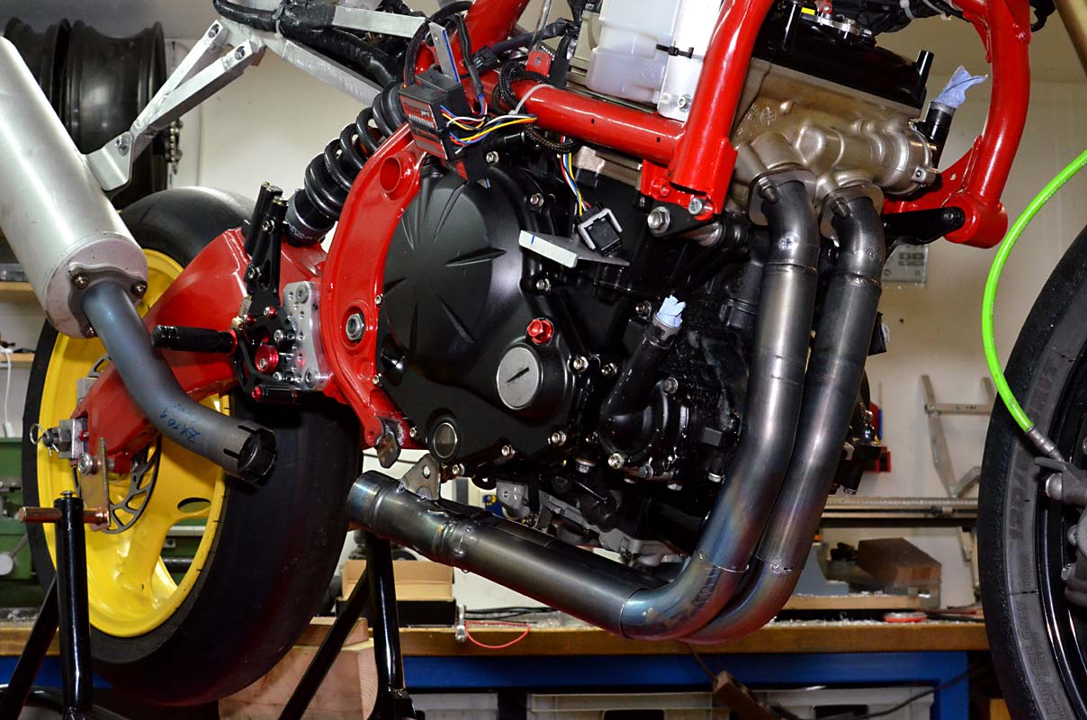 Der neue Krümmer verläuft jetzt wesentlich näher am Motor. Damit ist mehr Platz, um den Kühler vom Vorderrad weg in Richtung Motor zu bringen. Aktuell bringt der Krümmer 1.165 g auf die Waage, etwas mehr, als der erste Titankrümmer. Sind aber auch größere Rohre.