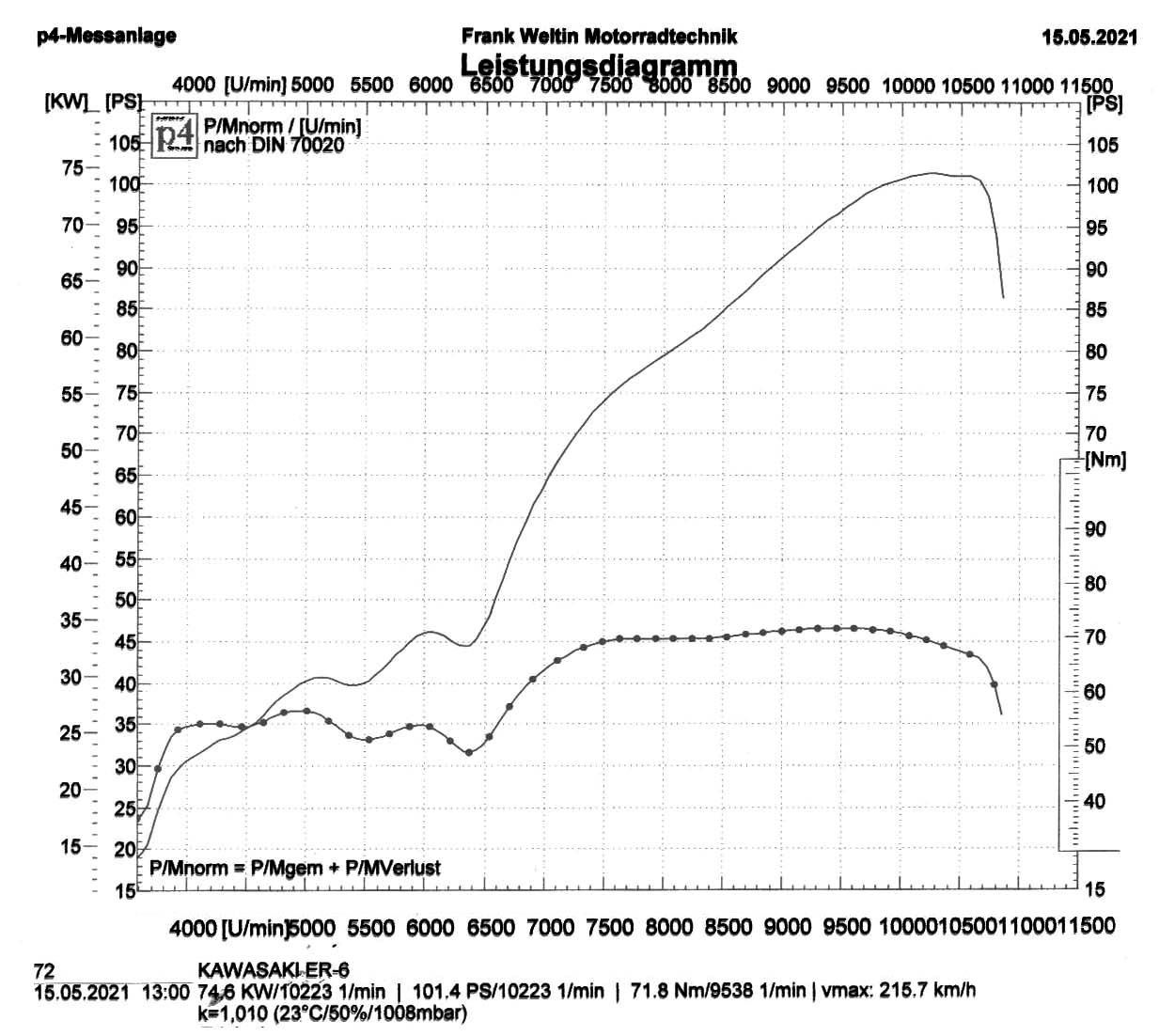 Die letzte Messung mit den 101 PS war der ganz kurze Trichter mit dem ganz langen Auspuffstück. Eine solche Kombi sollte eigentlich kontraproduktiv sein. Wollen wir hoffen, dass es so ist. Wenn das alles so halbwegs läuft, geht es noch mal zur Feinabstimmung. Mal schauen, ob die Amis bis dahin das Problem mit dem aktuell nicht anhebbaren Drehzahlbegrenzer gelöst haben. Da Kawasaki 12.000 U/min angibt, will ich das Limit von aktuell 10.200 U/min auf 11.0000 U/min anheben.
