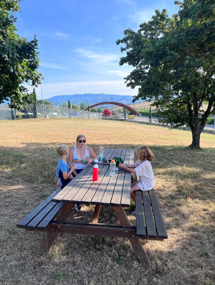 Nach gefühlten zwei Stunden konnten wir endlich einen Platz links am Zaun zwischen den beiden Durchfahrten beziehen. Davor parkte schon ein WoMo, und der ältere Herr baute gerade eine Gardena-Dusche am Zaun an. Er nickte uns zu und rief "Hier, wenn ihr mal duschen wollt!". Wow, solche Nachbarn waren Gold wert. Ich versuchte, so schnell wie möglich das Schlafgemach herzurichten, was nicht ganz einfach war, wenn man sich in Zeitlupe bewegte. Die Kindschaft versuchte, Schatten zu finden und ihn nicht zu verlieren. Zwischendurch wechselte sich "wir gehen heute Pizza essen" mit "heute muss nichts Großes sein" ab. Gegen acht entschied ich, dass ins Restaurant gefahren werden würde. Die Tausende von Kilometern geschuckelte Kindschaft hatte ein Recht darauf, sich heute ein vernünftiges Essen servieren zu lassen. Der Rest könnte warten, und Siesta wurde nicht ohne Grund erfunden.