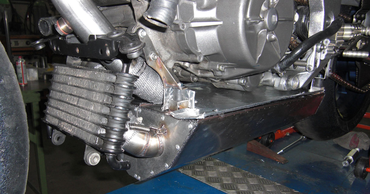Nachdem ich dann mal eine Vormontage mit Verkleidungen, Schalldämpfer und Ölkühler machte, war ich mir sicher, der Platz reicht niemals nie für 4 Liter Öl. Zwischen Zylinder und Verkleidung waren im oberen Bereich mal gerade 5 cm Platz, unten knapp über dem Dämpfer gab´s ein Stückchen Raum, da passten wahnsinnige 10 cm in der Tiefe rein. Das mir aber der Platz unter dem Kurbelhaus fehlte, klar war ja jetzt der Dämpfer ….. das war echt übel.