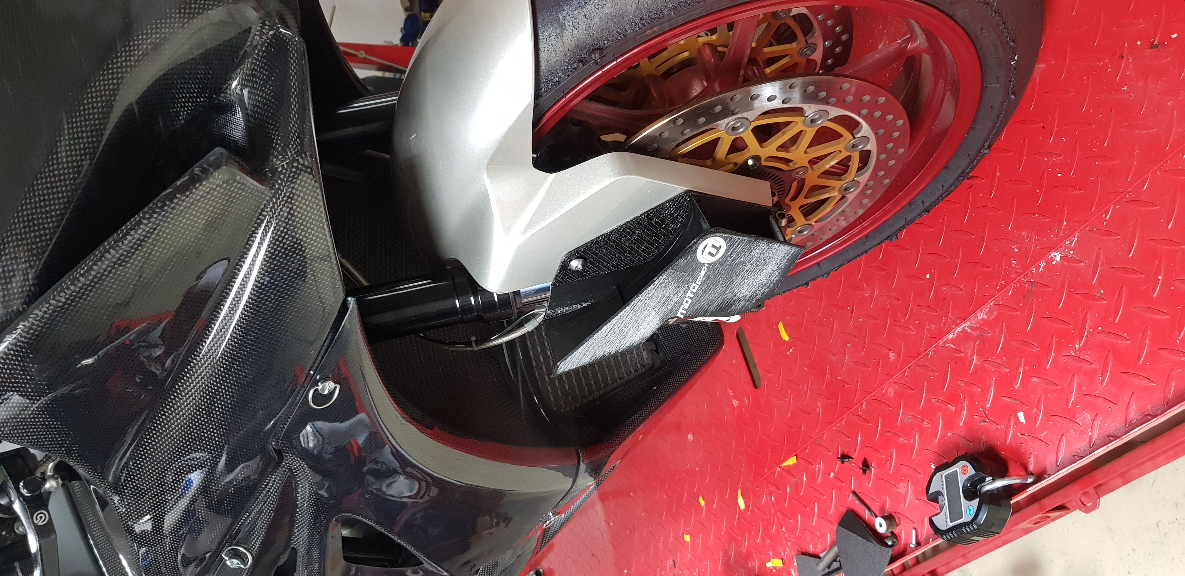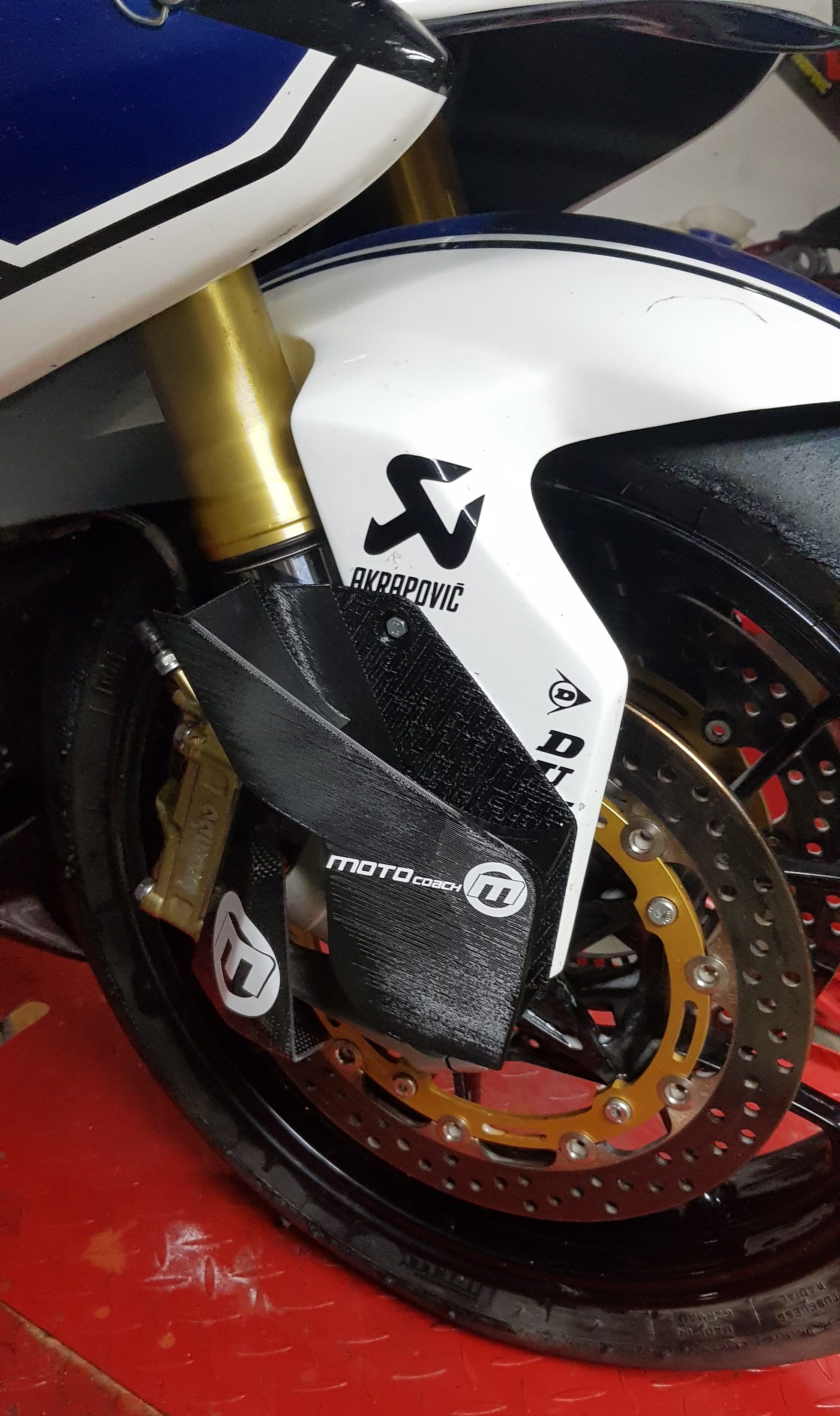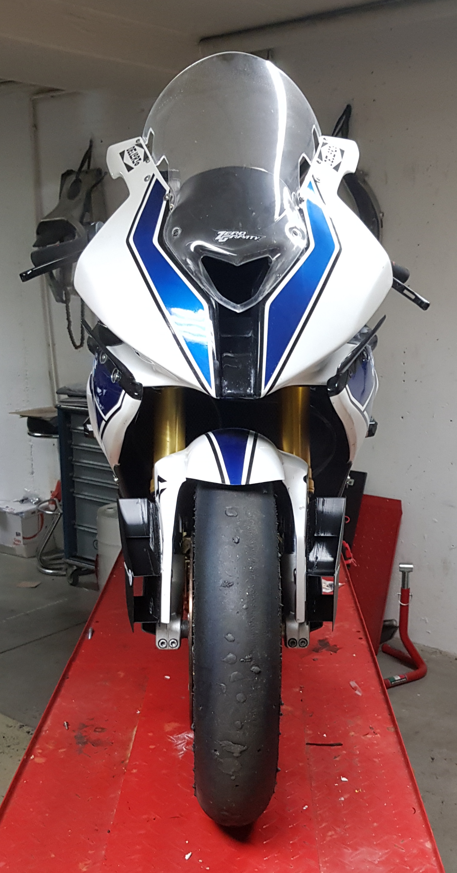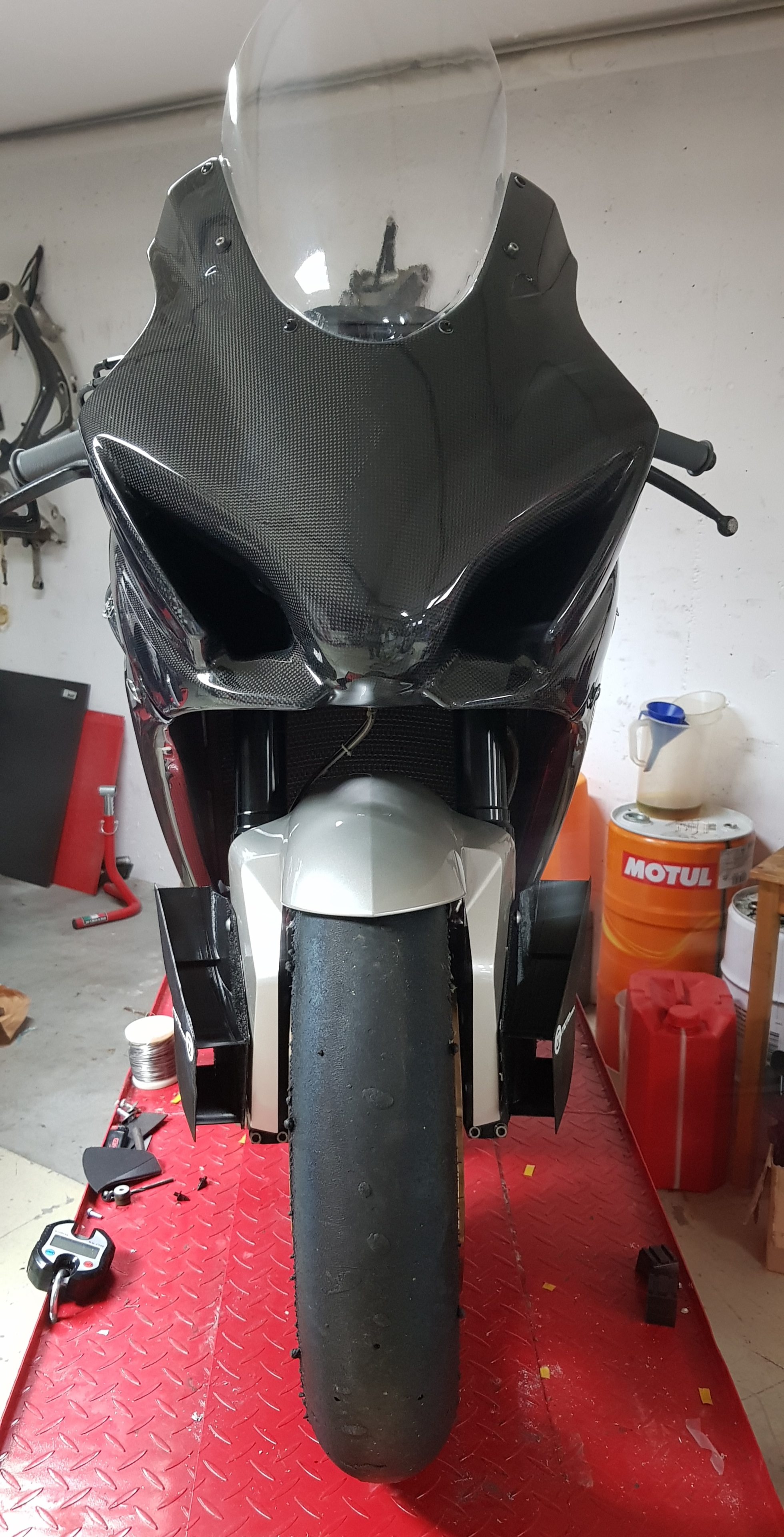 So hier geht's auch gut voran, die jungs vom Formel Team haben das Winglet mit Verkleidung um die Gabel gemacht und soweit nach unten gesetzt das beim anbremsen die Verkleidung das Winglet nicht abreißt.
