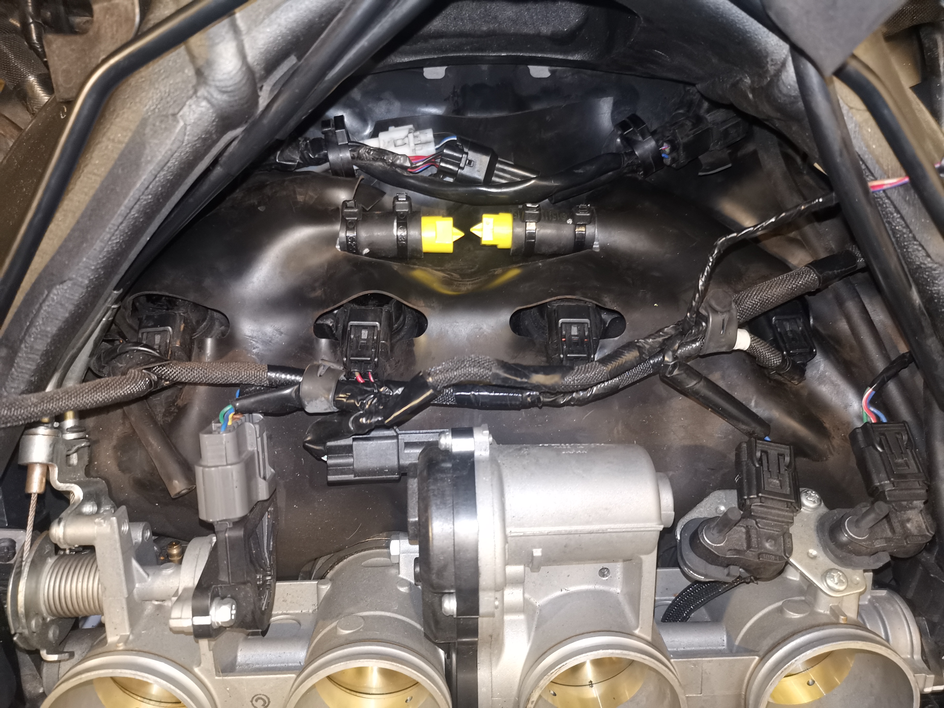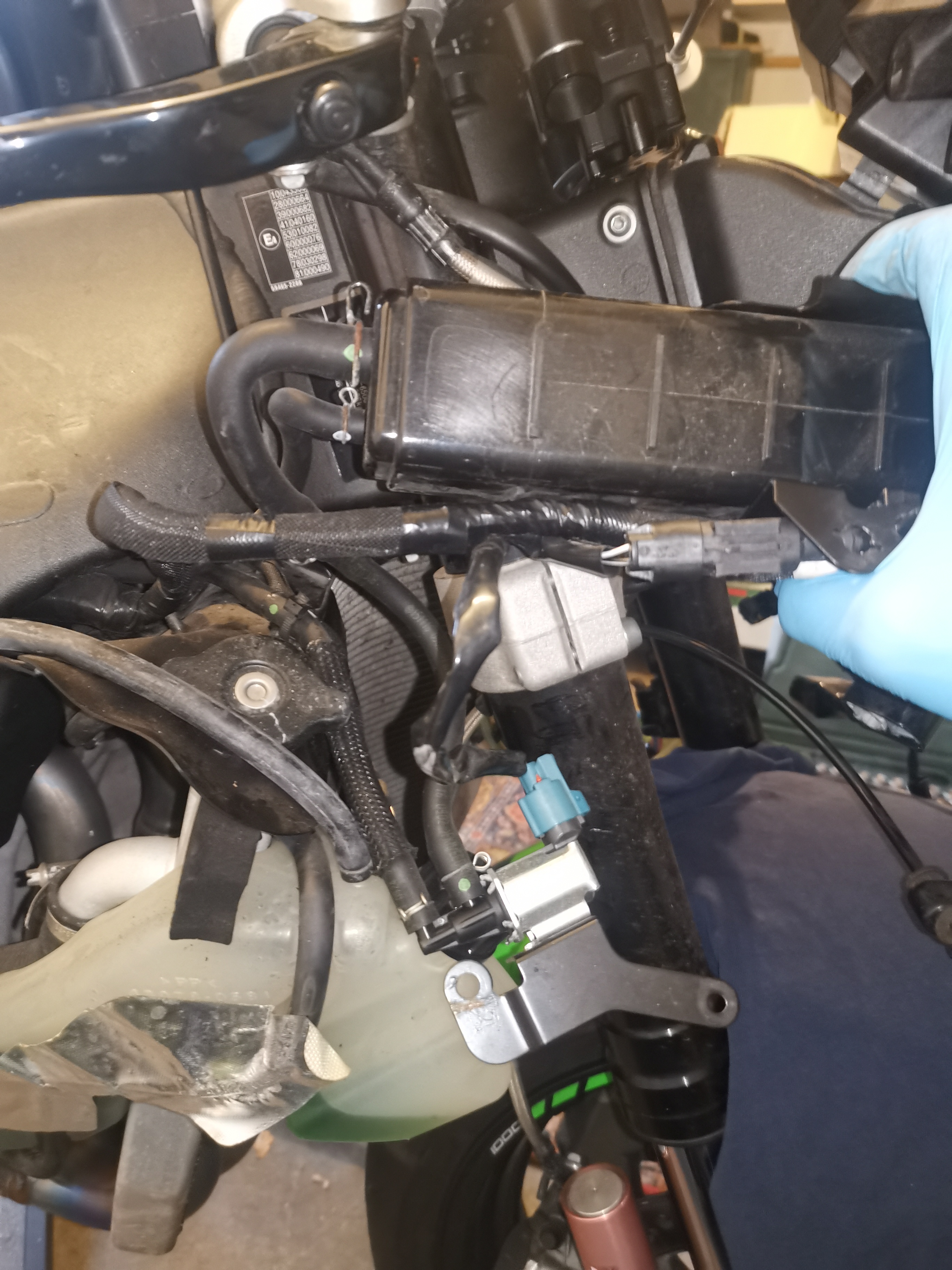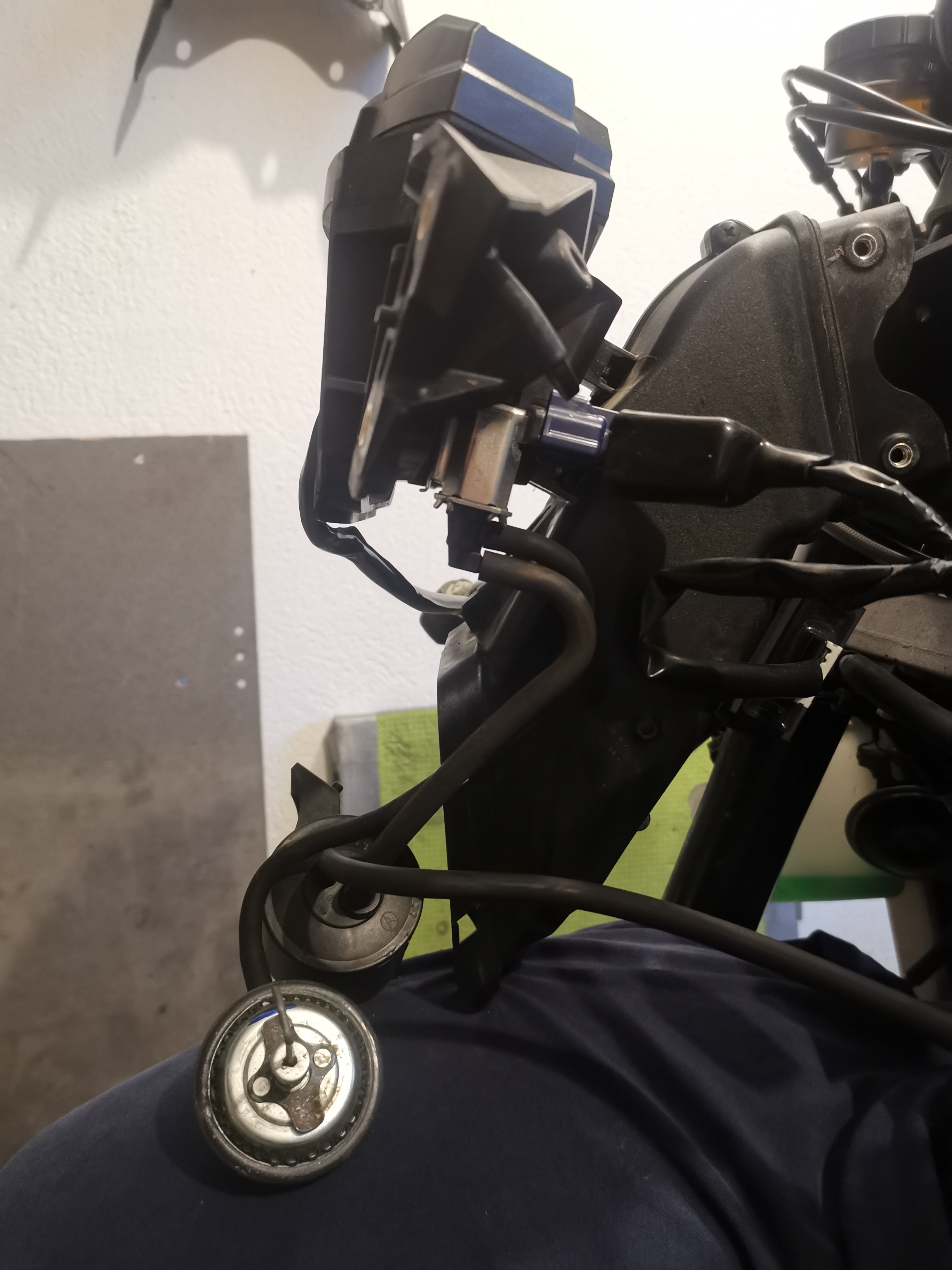 Wo du das schließt ist egal. Daran denken das es heiß wird und das es zuverlässig ist. Das ganze geschlauchs kann weg wie beschrieben. Das schwarze runde Teil wird ein Aktivkohlebehälter sein zur Tankentlüftung, kann weg. Den Schlauch vom Tank kannst du Sinnvollerweise in die Airbox führen oder nach Belieben ins freie.