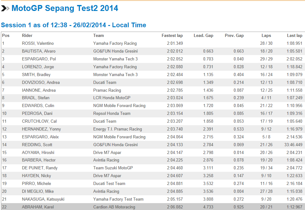 2 ROSSI, Valentino Yamaha Factory Racing 2:01.349 0.136 0.136 28 / 39 1:09.154