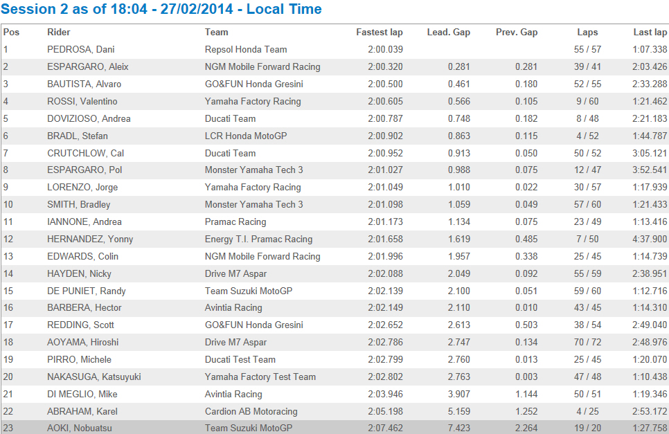 1 PEDROSA, Dani Repsol Honda Team 2:00.226 46 / 47 1:06.663