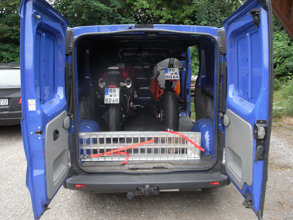 Ich habe einen L2H1 aus 2009, da hast du ninter den Mopeds noch jede Menge Platz. Die Bikes spanne ich einfach nach vorne an die äußeren Ösen und dann zur Mitte hin - alles easy, da genug Platz ist. Hinten mache ich dann jeweils noch einen Gurt zur Außenwand und fertig. Wenn ich Unfaller hole packe ich da auch 3 Bikes reinMarek_mrg hat geschrieben:ich entstaube das ganze mal hier.....