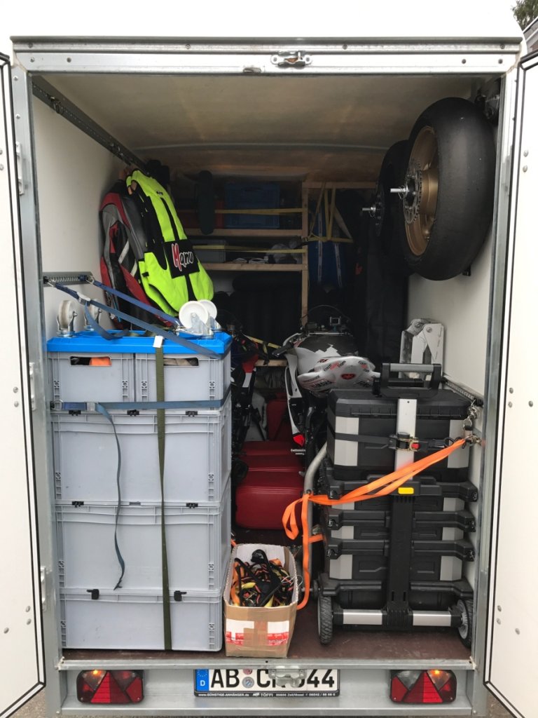 Oben hängen die Kombis und Felgen dran und die Kisten stehen an den HR der Mopeds an - wird als alles nur gegen die Wand gezurrt - da passiert gar nix beim Fahren...