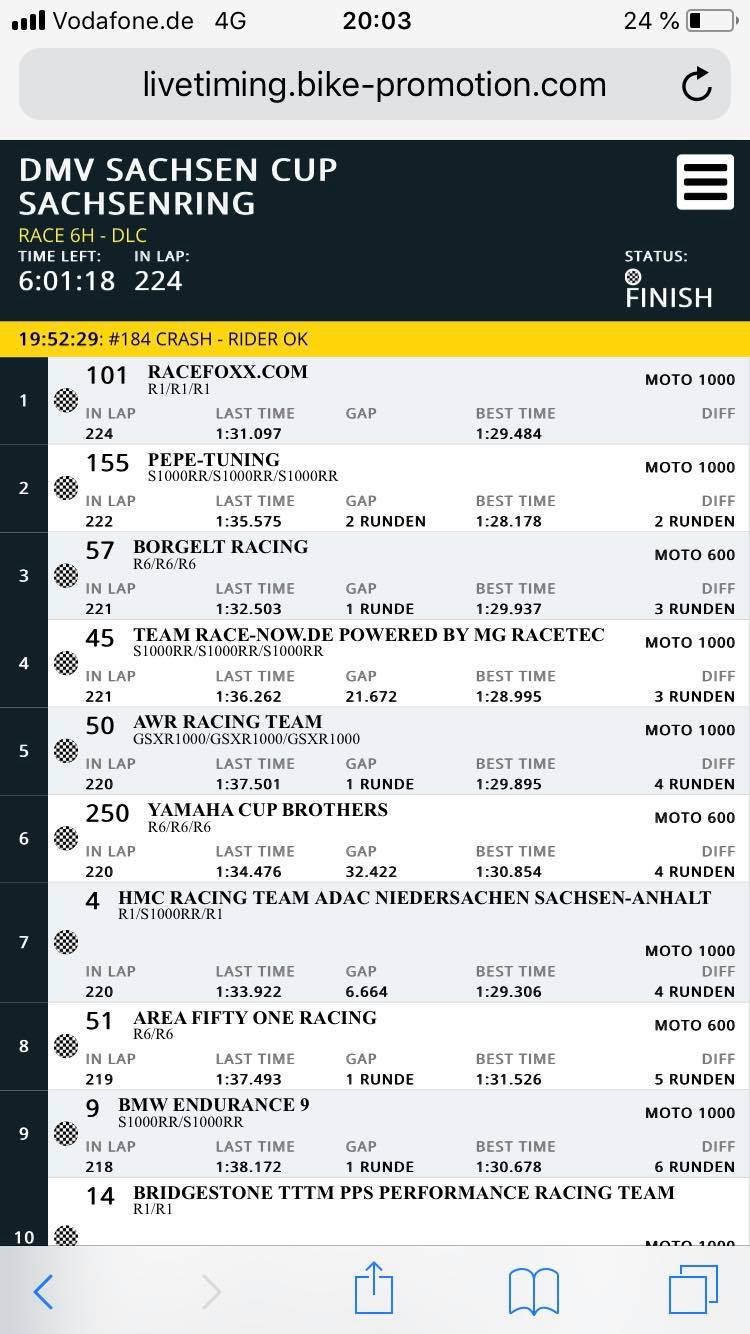 Lirum Larum, wir haben fehlerfrei, absolut fehlerfrei abgeliefert, sind alle 3 nahezu gleich schnell (Danny n zacken schneller) und absolut konstant mit 42er und 43er Zeiten gefahren. Kurz vor Rennende schob eine SC Phase das Feld zusammen, ich sollte das letzter dran sein, AWR nur noch wenige Sekunden vor uns! Ich kann euch versichern, dass war ein Krimi unter Freunden! Wir haben allein im Rennen bestimmt ne Schachtel geraucht![]()