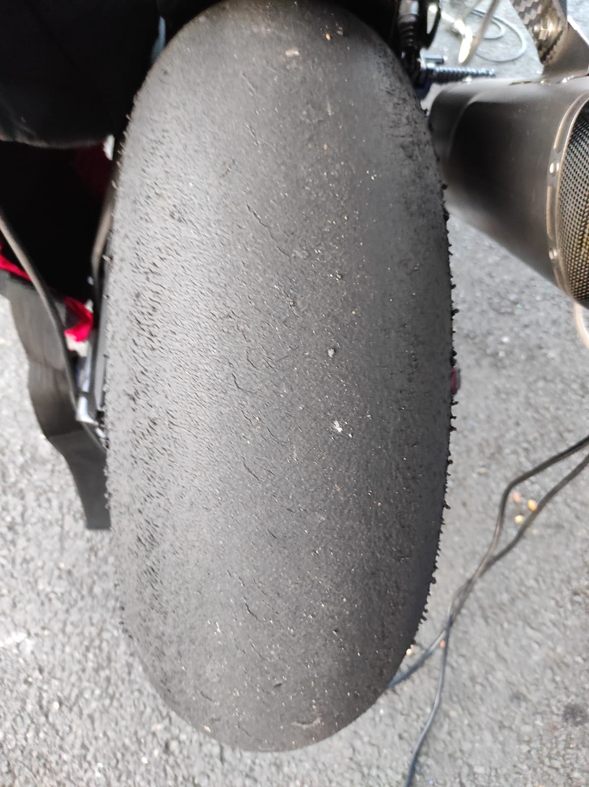 Hatte beim Reinrollen ein extrem instabil slidendes Hinterrad. Kurvenausgangs schlagartiger Gripabriss beim Anlegen. Hatte in dem Turn 1.22er Zeiten auf dem Laptimer, mein Gefühl hätte mir aber zumindest 20er oder 19er hoch suggeriert. Völlig aufgerissen dazu war der Reifen auch noch, obwohl ich sonst weder bei pirelli noch bridgestone Probleme hatte.