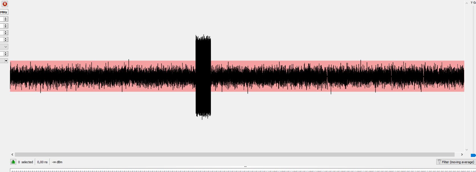 Jetzt fragt man sich vielleicht auf dem ersten Blick wie man da irgendwas entschlüsseln soll? Dafür muss man erstmal gehörig reinzommen (nicht dargestellt). Das Signal ist nämlich nur xx Millisekunden lang.