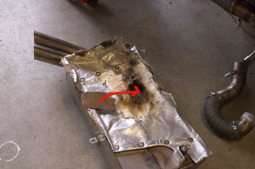 Boahh ey, hat das Teil Dampf, da hat´s ein zigarettenschachtelgroßes Blechstück aus dem vollen Blech gesprengt. Das musste wohl auf dem Prüfstand passiert sein. Das Teilchen klemmte zwischen dem Hitzeschild und der Außenhülle des Dämpfers.