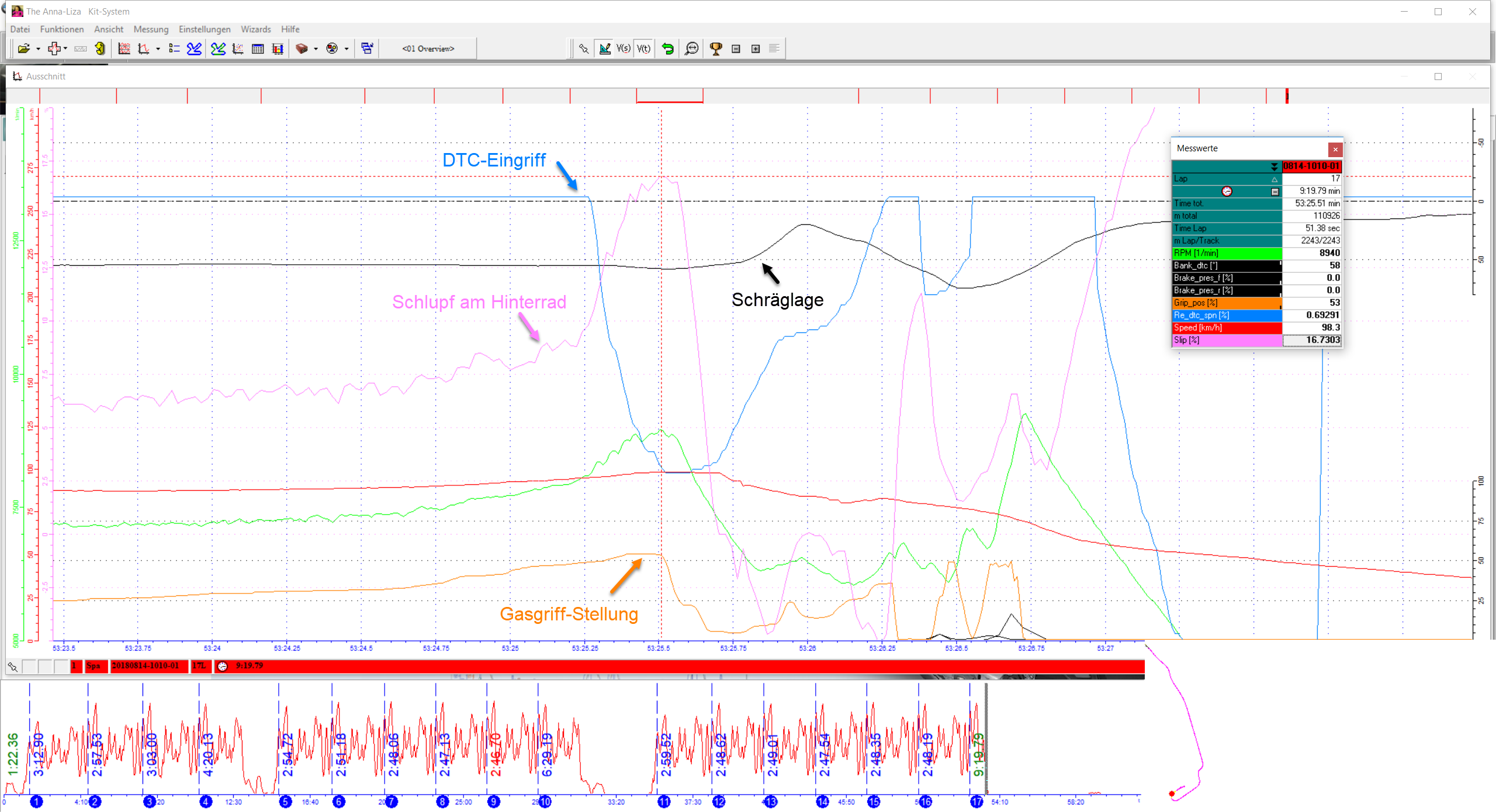 Ich möchte Deine Aussage zur DTC jedoch etwas relativieren: Ich denke, dass das DTC schon sehr ausgereift ist und grundsätzlich auch vor Highsidern schützen kann. Das System kann jedoch nicht jeden Highsider verhindern. In meinem Fall war es so, dass der Schlupf am Hinterrad auf einmal sehr stark zugenommen hat (siehe den 2D Auszug unten). Das DTC fängt da bereits bei Minute 53:52:25 an zu regeln. Das ist ca. eine viertel Sekunde, bevor ich merke, dass mir das Hinterrad weg geht und ich reagieren kann. Erst bei Minute 53:52:50 gehe ich vom Gas, aber da ist es bereits zu spät.