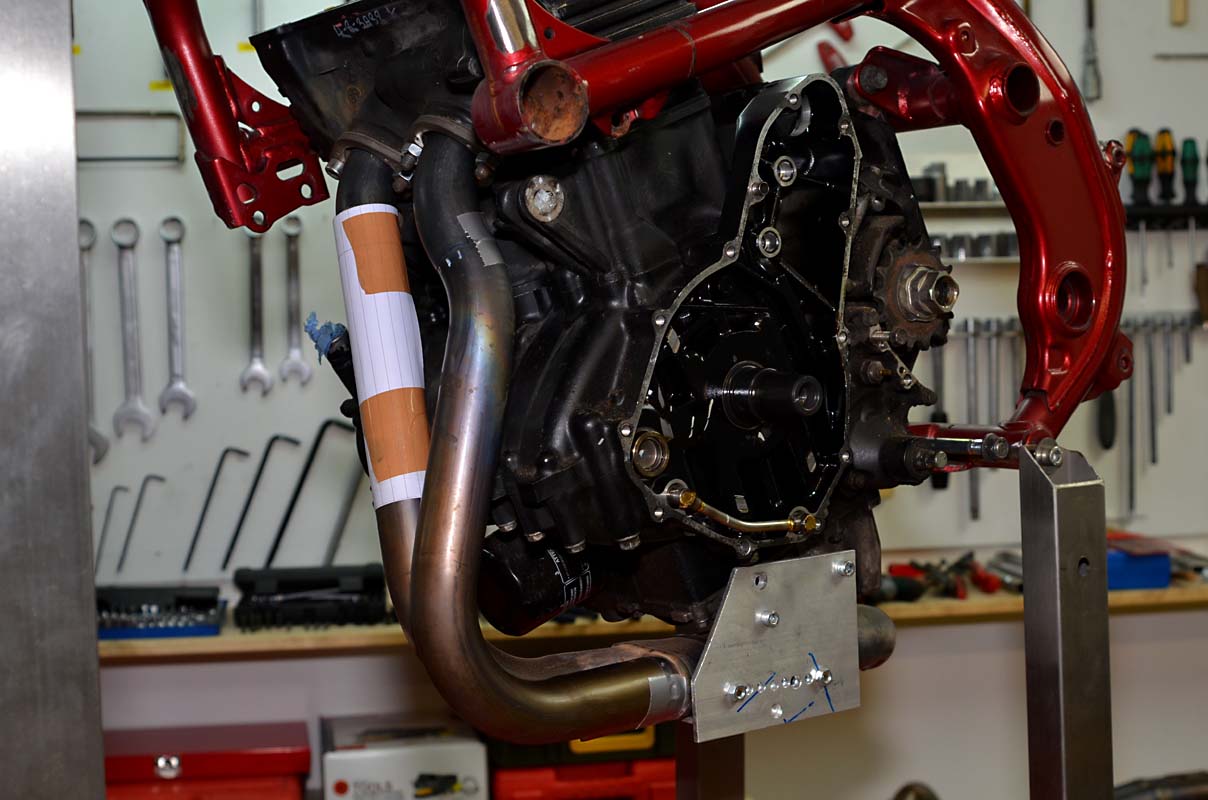 Heute bin ich mit dem Krümmer ein ganzes Stück weiter gekommen. Als erstes mal eine Halterung für den Sammler zusammengeschustert und am Motor befestigt. Damit ist der Sammler fixiert und die zweite Hand frei. den Krümmeranschluss am rechten Auslass befestigt und den Krümmer incl. Sammler nach Augenmaß ausgerichtet. Könnte hinkommen. Das Papier habe ich als Ersatz für ein Stück gerades Rohr genommen. Es lässt sich leicht auf die erforderliche Länge bringen und simuliert gerollt ein gerades Stück Rohr. Da man es auf dem Krümmerrohr gut verschieben kann, ist das ein schneller und leichter Weg, um zu prüfen, ob die Ausrichtung passt. Sie passt!