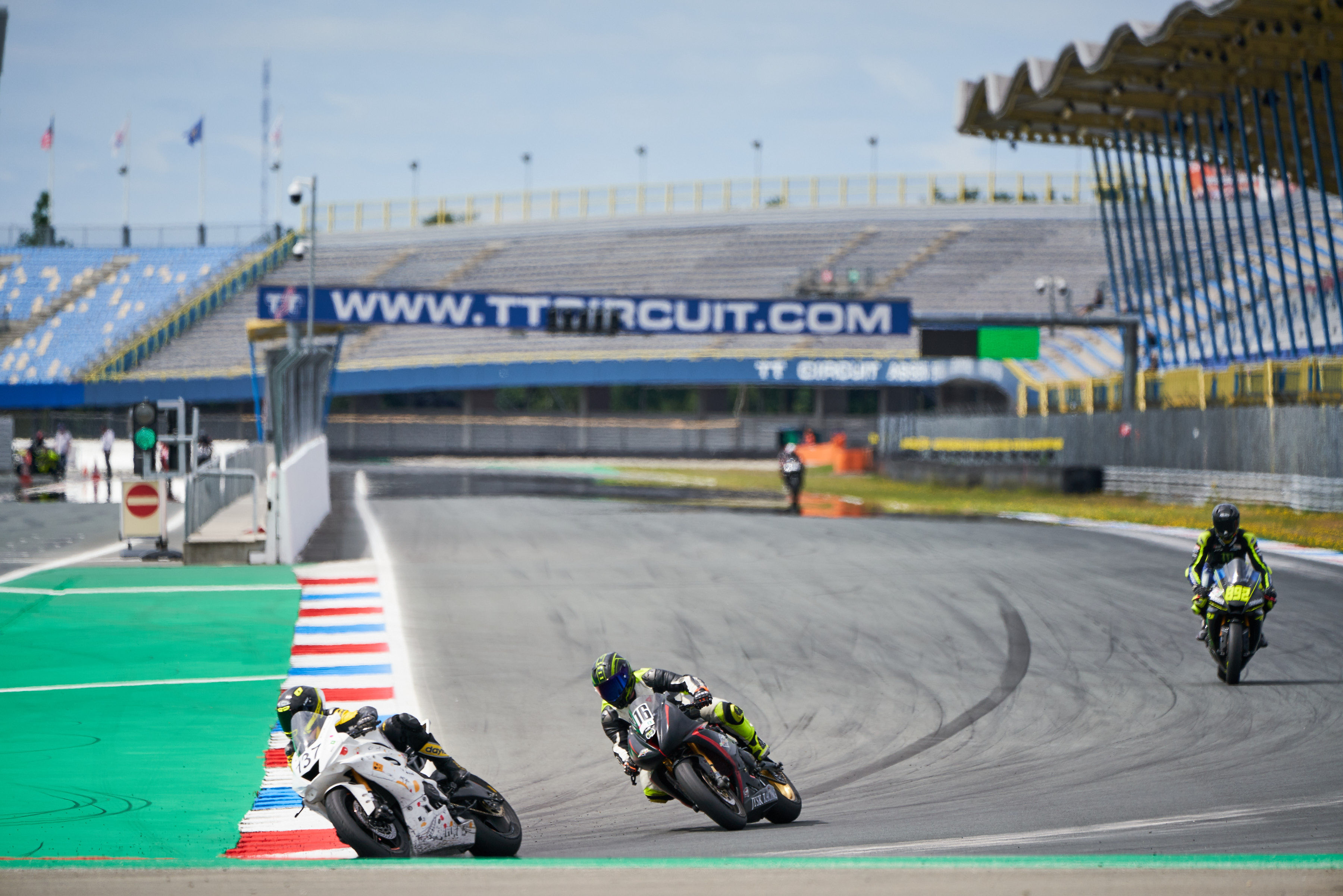Während wir zusammen ganz ordentlich darum kämpften, das ölige Drittel von Assen zu bewältigen, reihte sich in den anderen Gruppen eine rote Flagge nach der anderen an 60er-Phasen. Wie ich hörte, waren öfter als uns Rennstreckenfahrern lieb ist, auch mehrere beteiligt. Das heißt, mindestens zwei sind sich da nicht einig geworden. Ob das an der verstärkten Präsenz eines Vereins lag, der sich Hübschrollern (oder so ähnlich, hab's leider vergessen) nennt, wurde im Nachgang spekuliert, kann ich aber nicht bewerten.