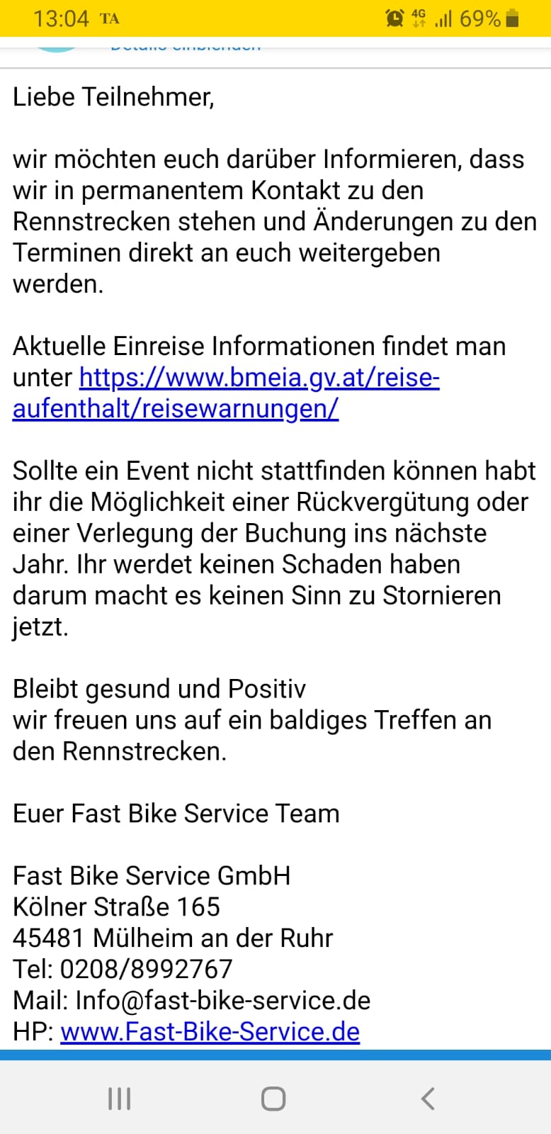 Die vorab Info von Fast Bike Service welche ich sehr Kundenfreundlich empfinde. Noch ist der Termin nicht abgesagt aber ich rechne nicht damit das dieser in einem Monat stattfinden wird. Naja wäre schade aber dann halt wieder nächstes Jahr!
