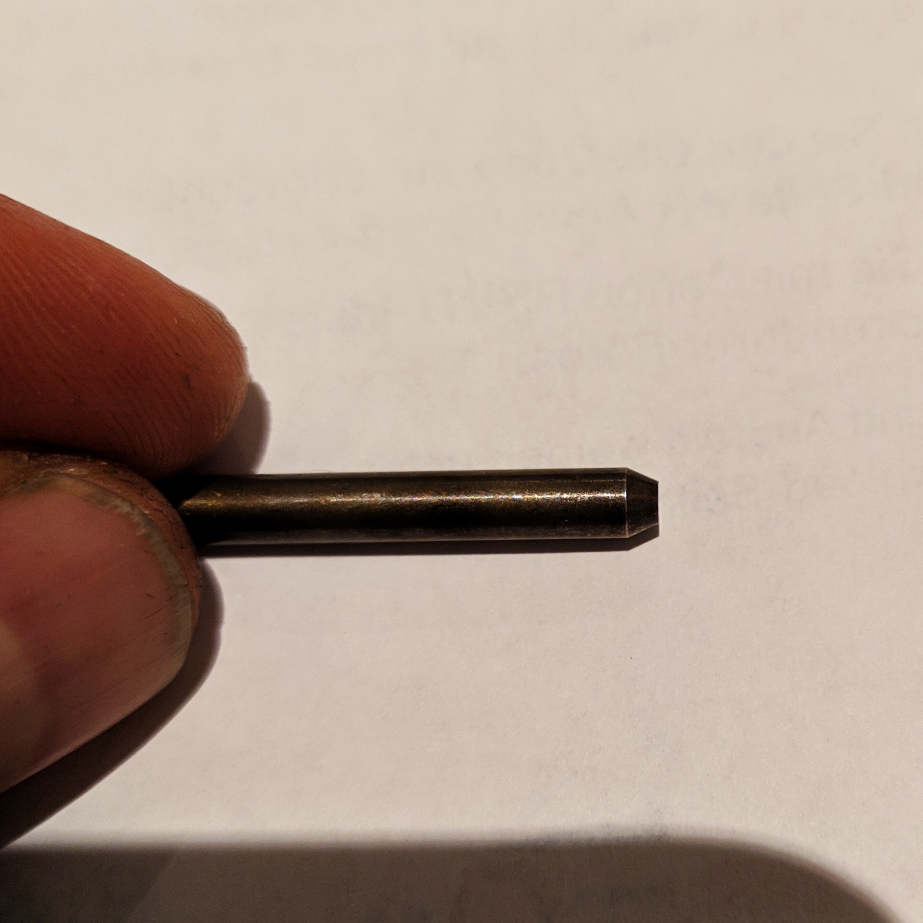 Der Nietdorn ist quasi neu, ich habe damit meine alte Kette geöffnet und das neue Nietschloss vernietet: So sieht der kleine unbenutzte Dorn aus, der große Dorn hat sich also schon verformt: