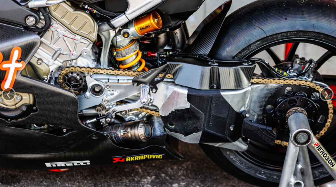 Ein neues Detailbild von Bautistas V4R, gut zu sehen die neue Schwinge mit Protektoren und Zehenschutz aus dem 3D-Drucker. Auch gut zu sehen, die Pirellis werden als Schnur auf die Karkasse gespritzt.