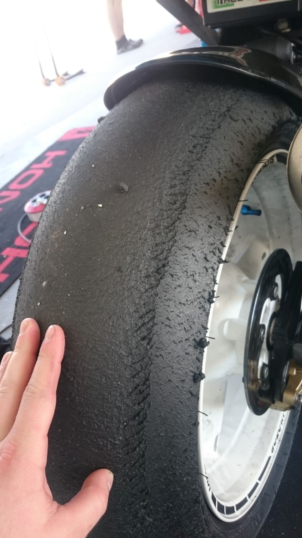 Luftdruck 1,55bar Heiß hinten und vorne 2,25bar Heiß . Ich bin am 2ten Tag im ersten Turn mit 1,7 gefahren, weil die Temperaturen noch unter 30 Grad Asphalt lagen, danach ist er aufgerissen es wurde immer schlimmer, der Reifen hat eine richtige "Grube".
