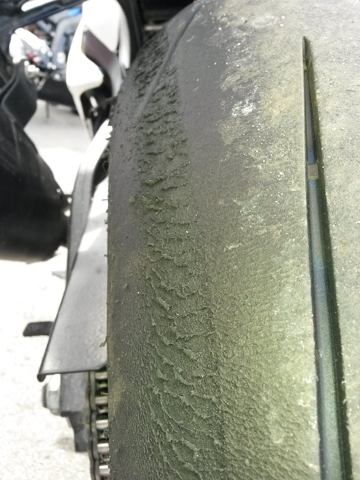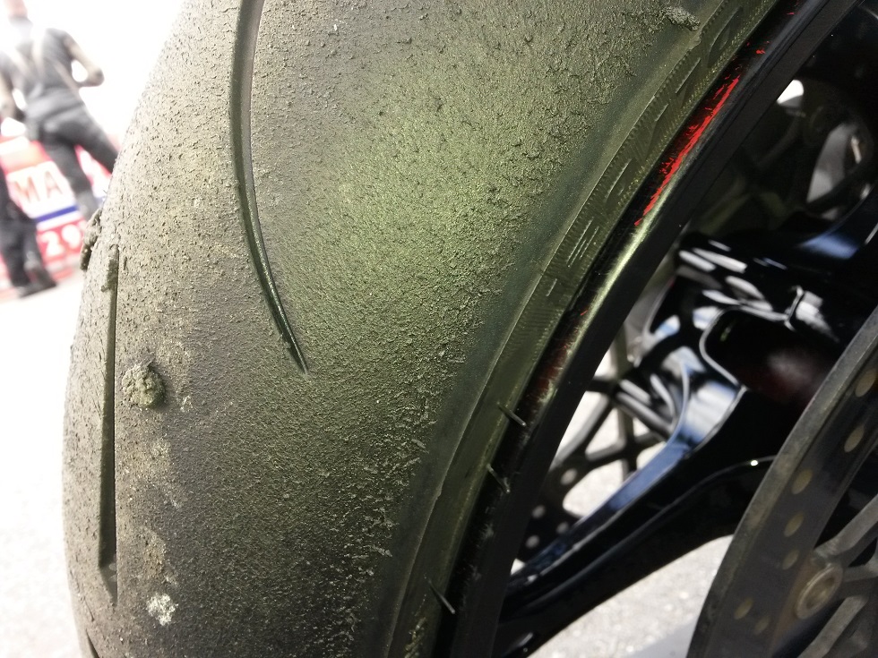 Leider hatte ich nicht die ideale Reifenpaarung dafür eingepackt, hinten hatte ich einen 190/60 Conti Endurance, der ist auf der rechten Flanke extrem schnell verschlissen, Reifenbild gut nur halt 70% "Profil" in 3 Turns vernichtet. Im letzten Turn hatte ich dann bei der Verfolgung meines Kumpels einige starke Rutscher.