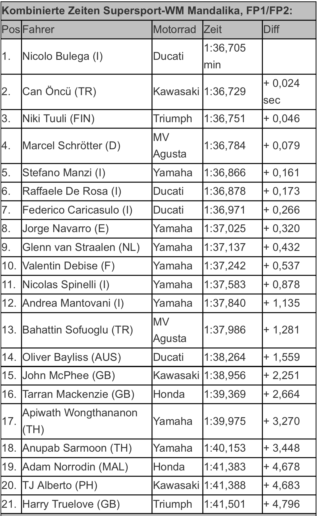 Hier mal die kombinierten Zeiten aus FP1 und FP2 der WSBK und SSP.