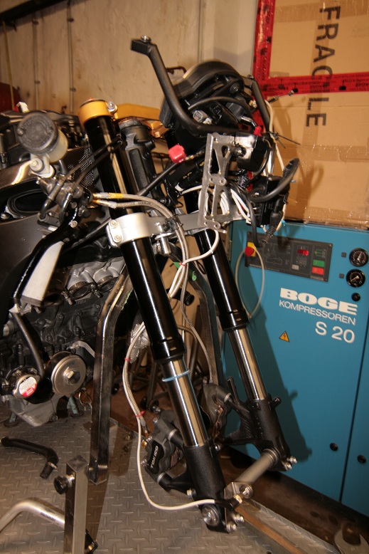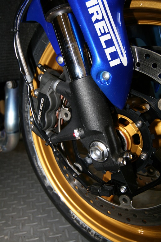 Da musst Du Löcher und Gewinde von unten in einen Gabelfuß bohren (ist aber keine große Sache). Vielleicht ist das Teil auch vom CBR Superbike oder besser gesagt, die Öhlinsgabel hat dort Löcher serienmäßig.