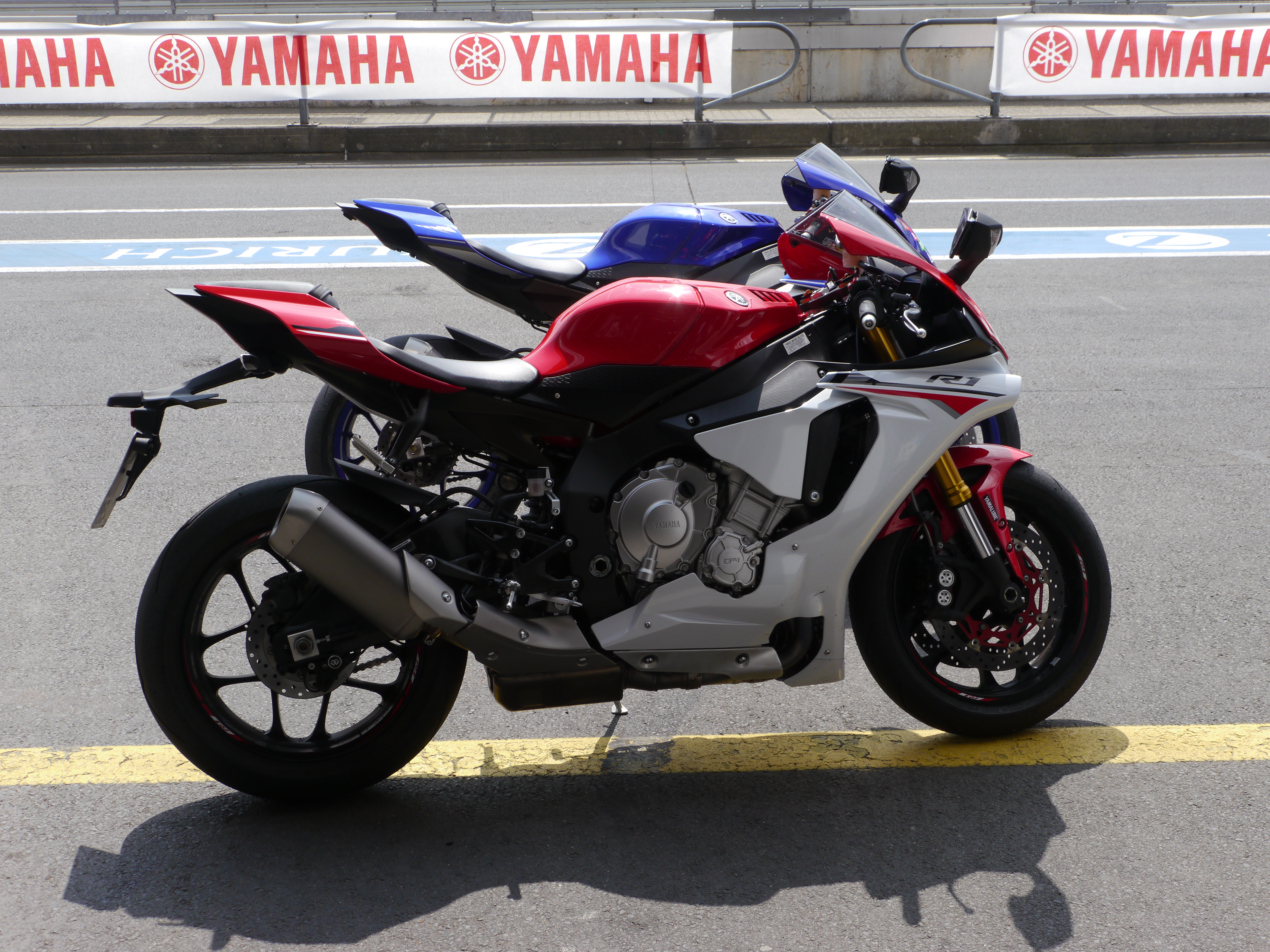 Das Wetter war traumhaft, das Motorrad - so viel vorab - ist es auch. Cool war die Yamaha Box (die für jeden Yamaha Fahrer, der den Yamaha Trackday buchte, offen stand): Es gab kalte Getränke, das R1 Forum hatte einen größeren Stand, außerdem konnte man Probefahrten mit der R1 machen und sich die ganze R-Series von der R125 über R3, R6 und R1 bis hin zur R1M ansehen. Neben mir als Vertreter von R4F waren noch einige weitere Blogger und Betreiber von Moppedforen dabei (wobei, eigentlich gibt es nur ein Forum auf der Welt, aber egal...). Die R1M war leider nur zum Anfixen und maximal Anfassen da, nicht jedoch zum Fahren.