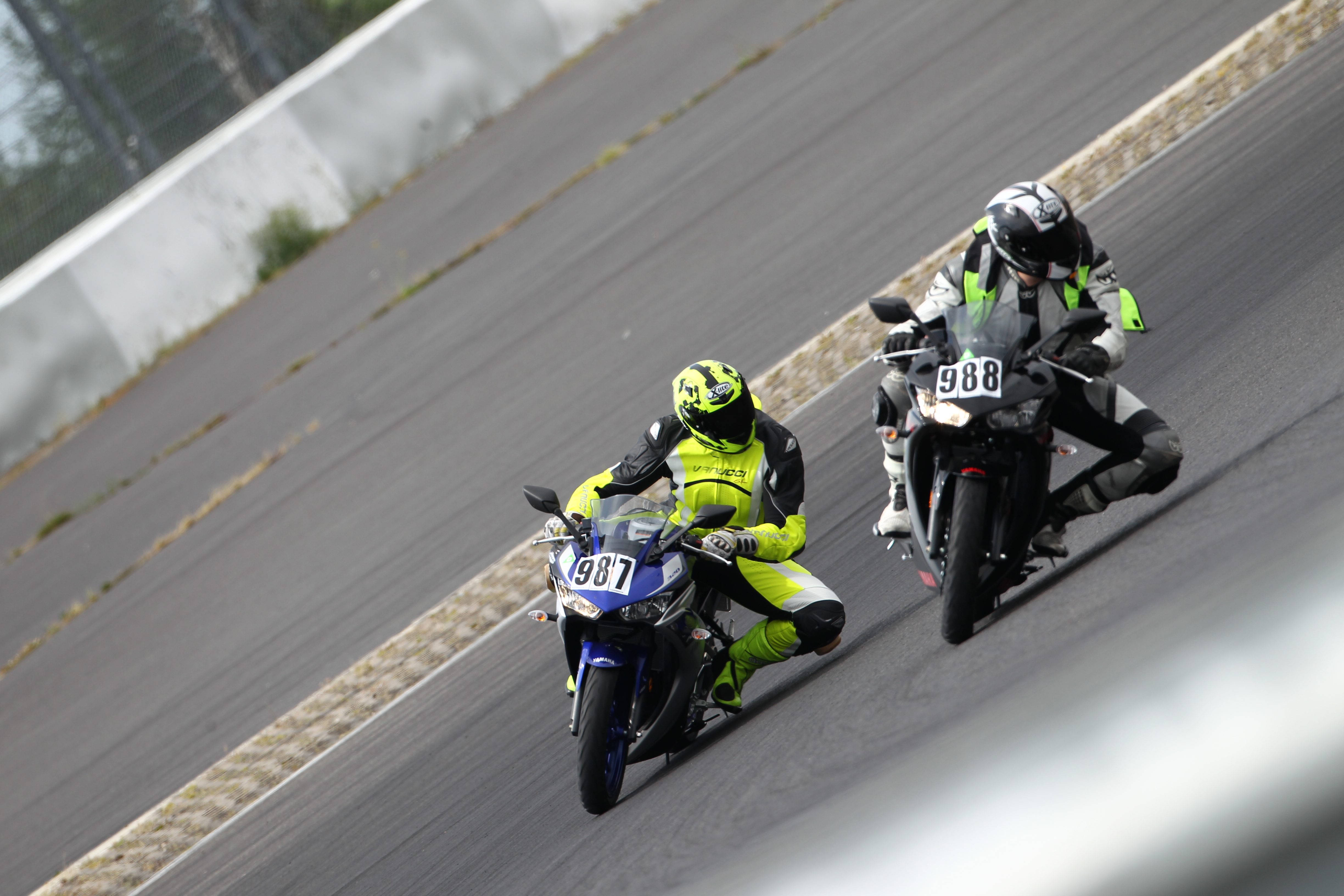 Die Maschinen waren natürlich absolut Serie, d.h. mit Kennzeichen, Spiegeln und so. Nur mal Zwischendurch: "Kennzeichenfahrer" kannte ich als Beleidigung bis heute noch gar nicht, find ich aber super. Rennreifen und Reifenwärmer gab's nicht, aber der straßenzugelassene Pirelli Diablo Supercorsa SP schlug sich auch bei den hohen Temperaturen sehr gut. Würde eigentlich auch gerade bei einem Motorrad mit einem so umfangreichen Paket an Assistenzsystemen Sinn machen, mal schlechtere Reifen zu montieren, um den Regelbereich zu zeigen...